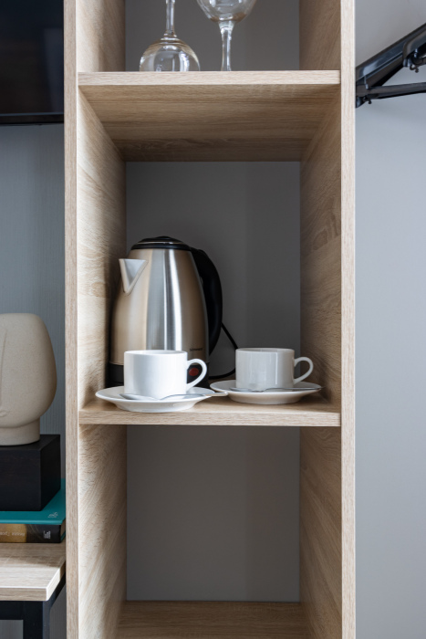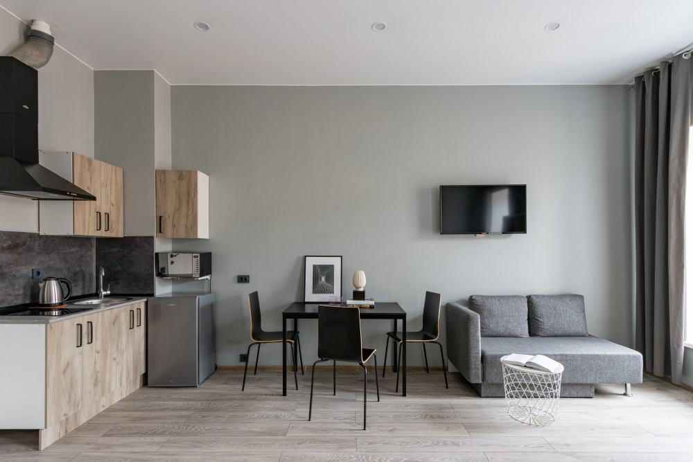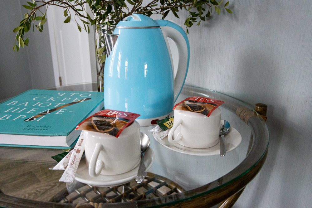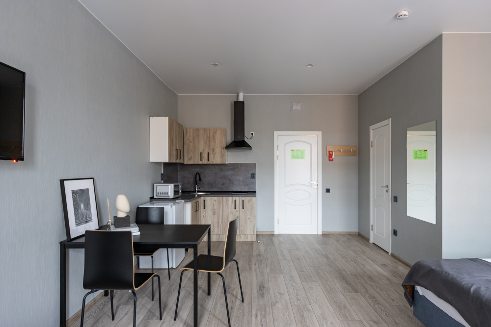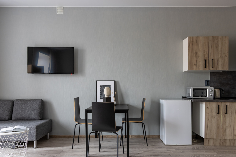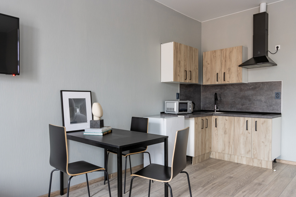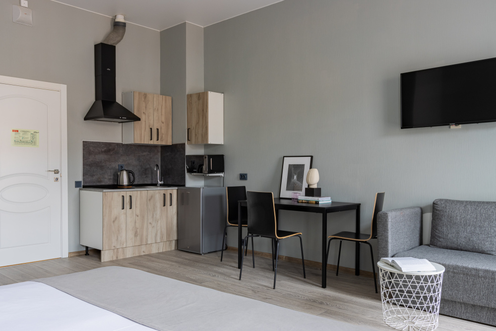 • кухня (обеденная зона, чайник, плита, кухонные принадлежности, СВЧ-печь, холодильник);