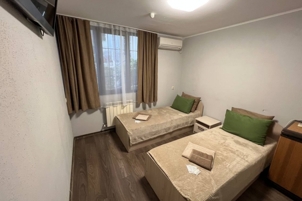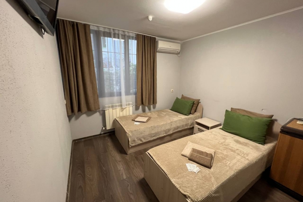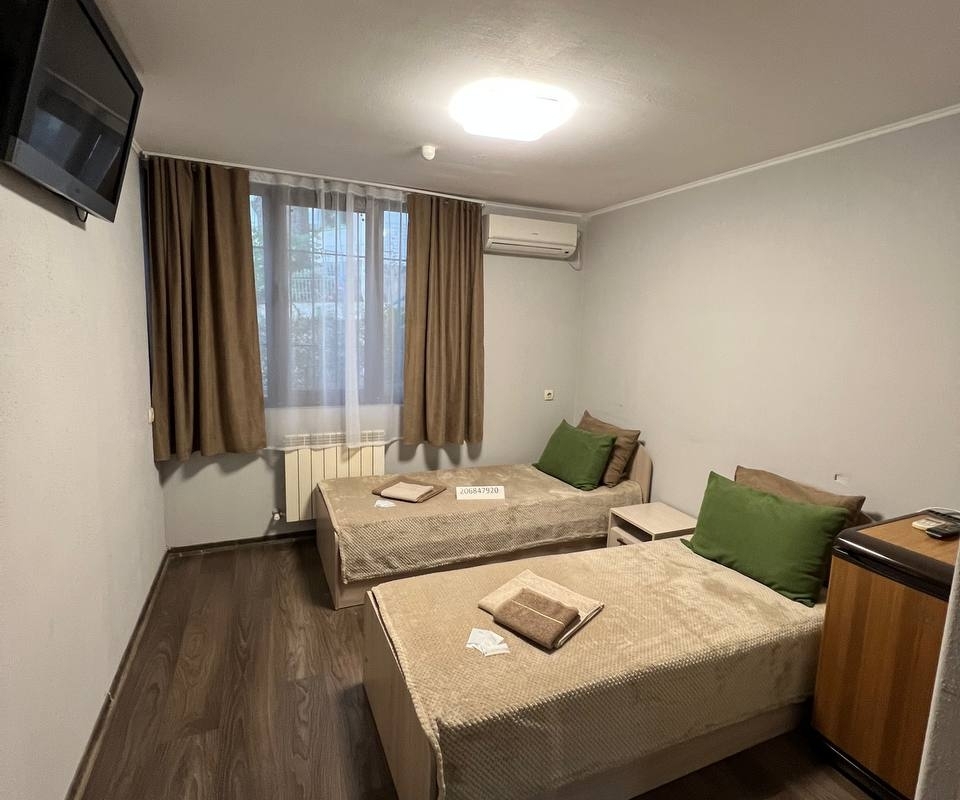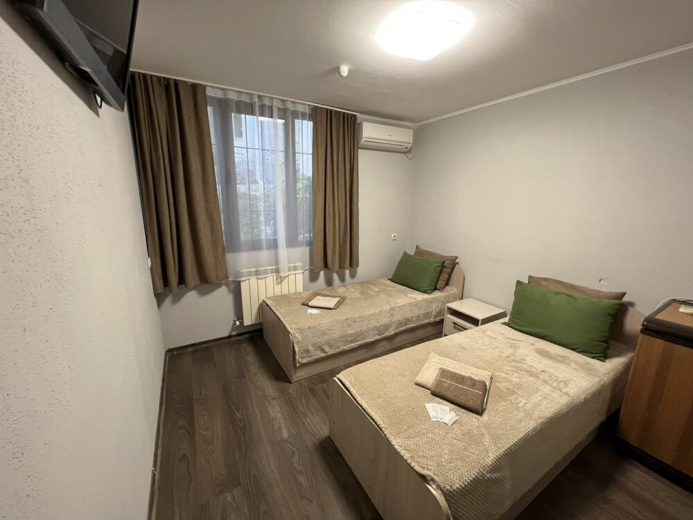 Номер «стандарт» с двумя односпальными кроватями , телевизором, кондиционером, ванной комнатой, с выходом во внутренний двор.