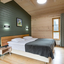 В коттедже №22 кровати могут быть раздвинуты или сдвинуты (сверху двуспальный топпер), в остальных коттеджах кровати целиковые двуспальные.