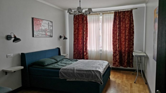 1. Полный набор техники — фен, плойка, утюг, гладильная доска, стиральная машина Бош, микроволновая печь Бош, холодильник Сименс и всё необходимое для приготовления кофе и чая.
