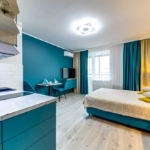Апартамент 30 кв.м более просторный, улучшенный. Единое пространство с оборудованной кухней, обеденной и спальной зонами и балконом с гардеробом. Один из самых больших апартаментов-студий в комплексе.