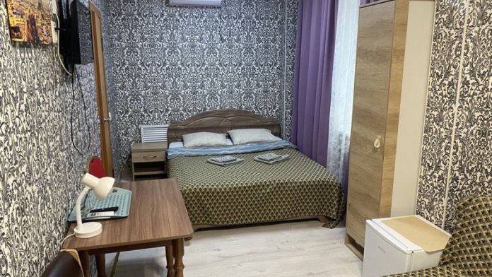 В номере: двухспальная кровать, тумбочки, ТВ, стол, стул, вешалка для одежды. Пол: ламинат.