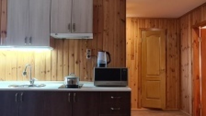 - кухня с СВЧ-печью, плитой, холодильником, посудой