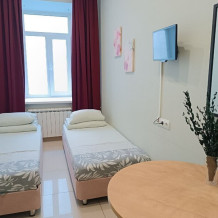 Предлагаем Вам уютную 2-местную комнату со всем необходимым для комфортного отдыха. Комнаты выполнены в классических тонах. Кровати с ортопедическими матрацами и качественным бельём окутают Вас уютом. Полотенца, по 2 шт. на каждого гостя. Потолки 3 метра.