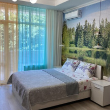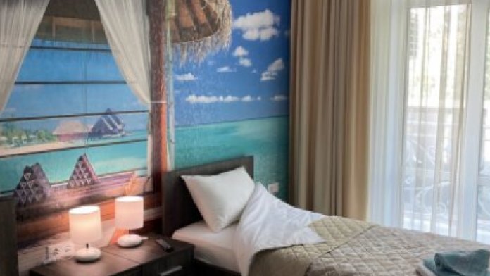 Семейный номер, с двуспальной кроватью и раскладным диваном (140*180 см). В номере есть балкон с видом на парк, ванная комната с душевой кабиной и набором косметических средств, фен, телевизор, кондиционер, электрочайник и посуда, холодильник, WI-FI. В номере возможно размещение либо 3-х взрослых, либо 2 взрослых и 2 ребенка.
