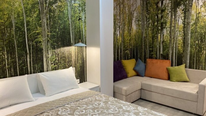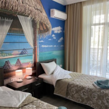 Семейный номер, с двуспальной кроватью и раскладным диваном, находится на 3 этаже. Диван (140*180). В номере есть балкон с видом на парк, ванная комната с душевой кабиной и набором косметических средств, фен, телевизор, кондиционер, электрочайник и посуда, холодильник, WI-FI. В номере возможно размещение либо 3-х взрослых, либо 2 взрослых и 2 ребенка.