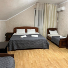 В номере:1 двуспальная и 1 односпальная кровать. Имеется телевизор, кондиционер, холодильник, отопление, шкаф, вешалка для одежды, журнальный столик.