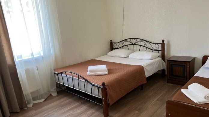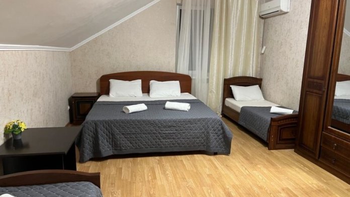 В номере: 1 двуспальная и 2 односпальные кровати. Имеется телевизор, кондиционер, холодильник, отопление, шкаф, вешалка для одежды, журнальный столик.