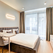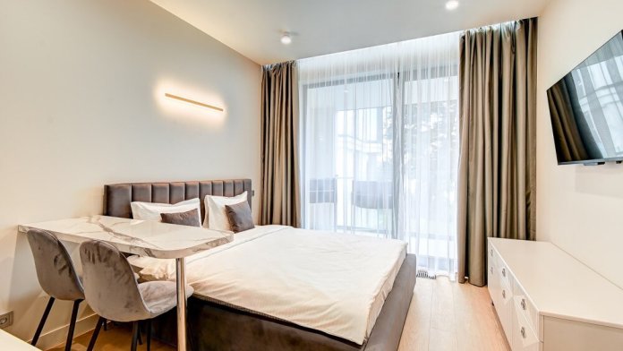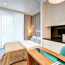 Широкий выбор апартаментов различного размера и конфигурации, чтобы соответствовать потребностям различных клиентов, будь то семьи, пары или деловые путешественники. От студий стандарт до номеров «Grand Luxe». Только высокое качество номеров с современным дизайном, удобствами и полным набором необходимых удобств для комфортного проживания. Полностью оборудованная мини-кухня, мягкая мебель из велюра, система кондиционирования и встроенного отопления, LCD-телевизор с цифровыми каналами и радио, фен, окна и двери с повышенной звукоизоляцией, высокоскоростной Wi-Fi, косметический набор.