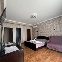 В номере: 1 двуспальная кровать и 1-диван двуспальный.