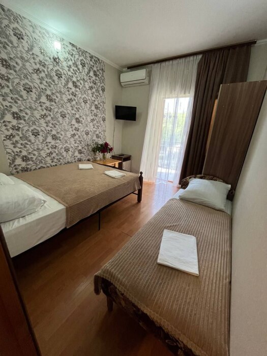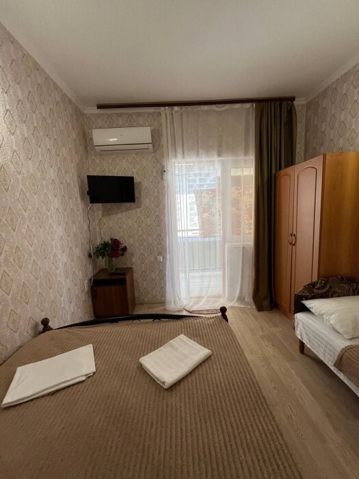 Подходит для размещения 5 человек. (2 основных места и 3 дополнительных) Имеет спальню с приятным интерьером. В номере: 1 двуспальная кровать, 1 двуспальный диван, 1 односпальная кровать. Имеется телевизор, кондиционер, шкаф, вешалка, обеденный стол, рабочий стол, стулья, кухня, посуда, столовые приборы, чайник, холодильник, электрическая плита.