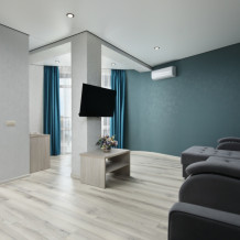 Просторный двухкомнатный номер с двуспальной кроватью, двухместным раскладным диваном и двумя креслами-кроватями.