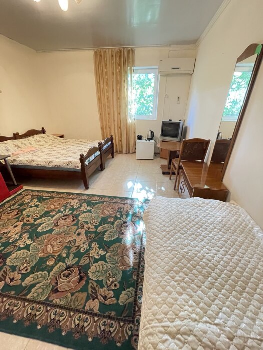 В номере одна двуспальная и две односпальные кровати или четыре односпальные кровати.
