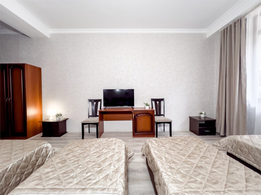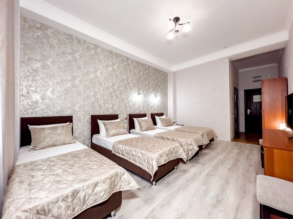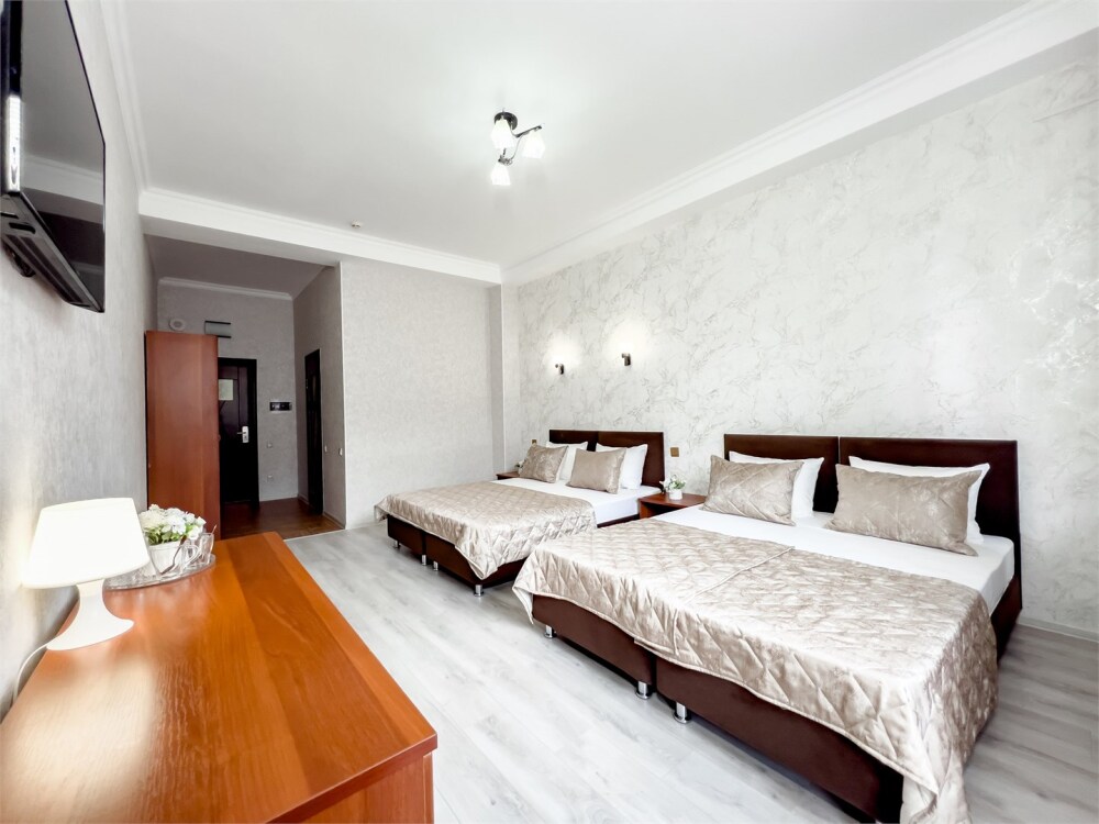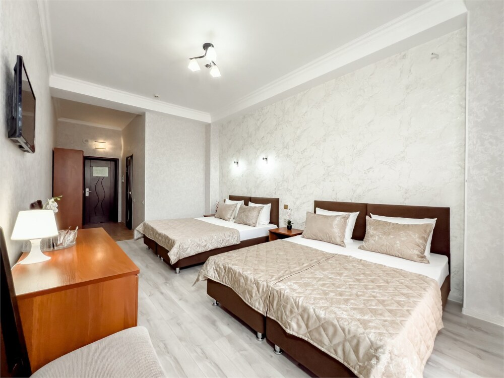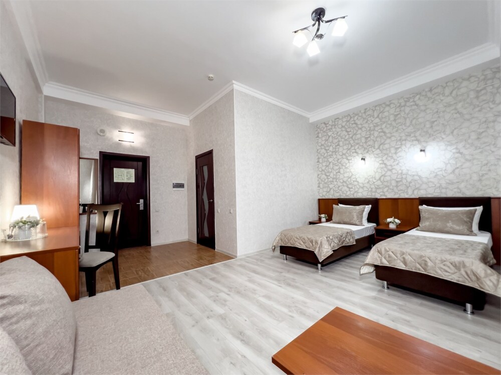 Просторный и функциональный номер с видом на городской пейзаж. Оснащен всем необходимым для комфортного пребывания: удобные кровати и диван, эргономичная рабочая зона с удобным столом и креслом, современная ванная комната. Идеальный выбор для деловых поездок и семейного отдыха с возможностью размещения до 4 человек. Один ребёнок до 5 лет — можно без отдельного спального места.