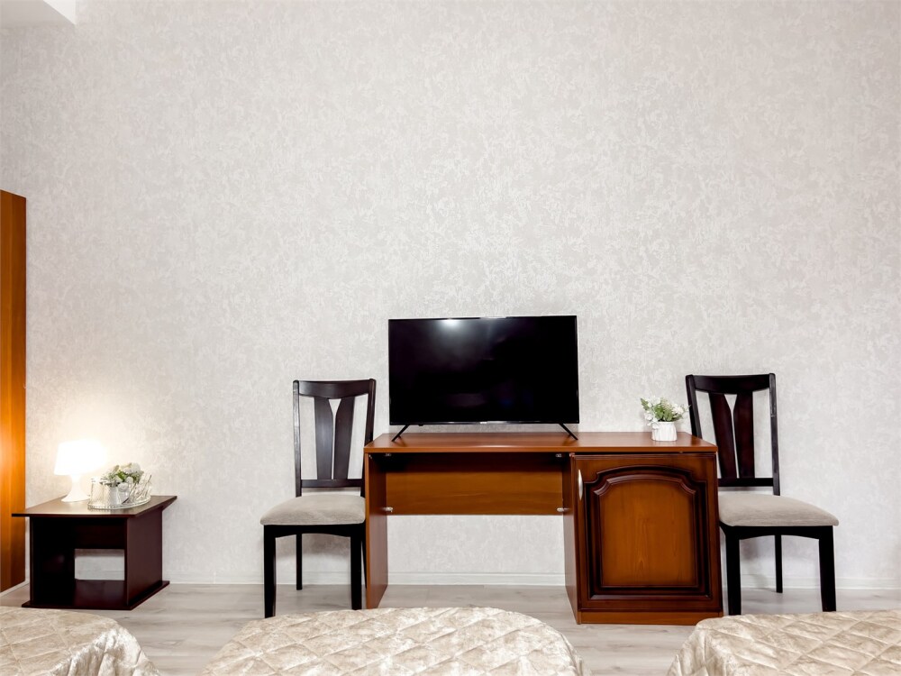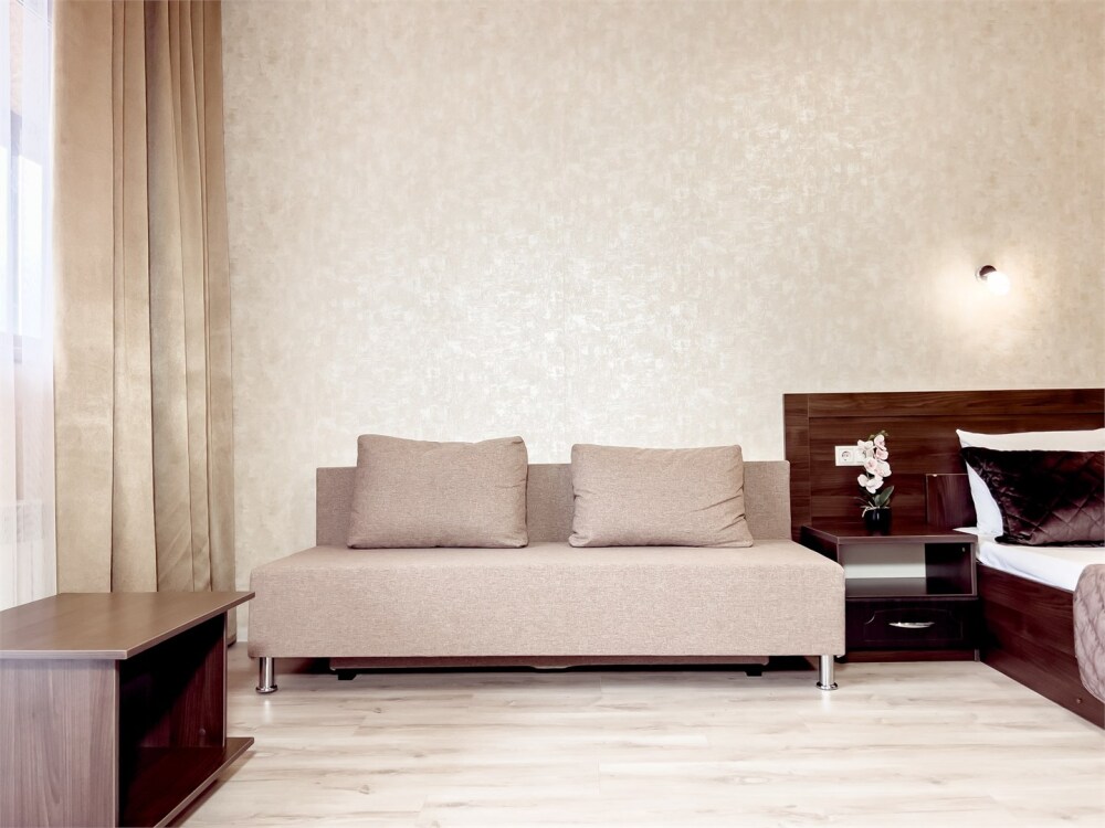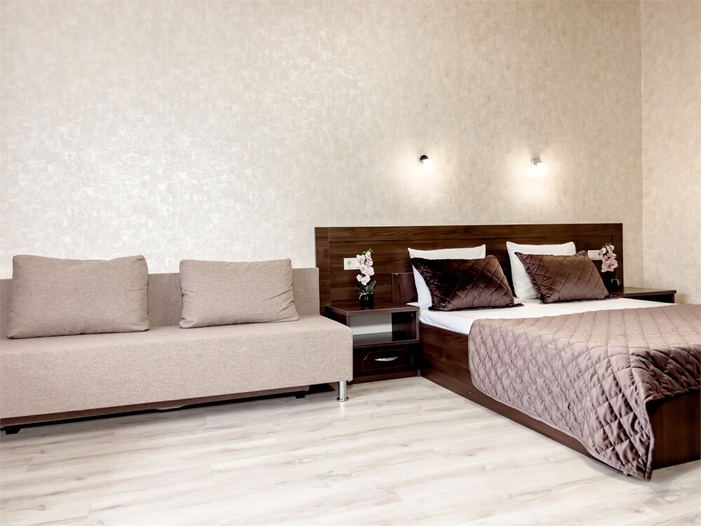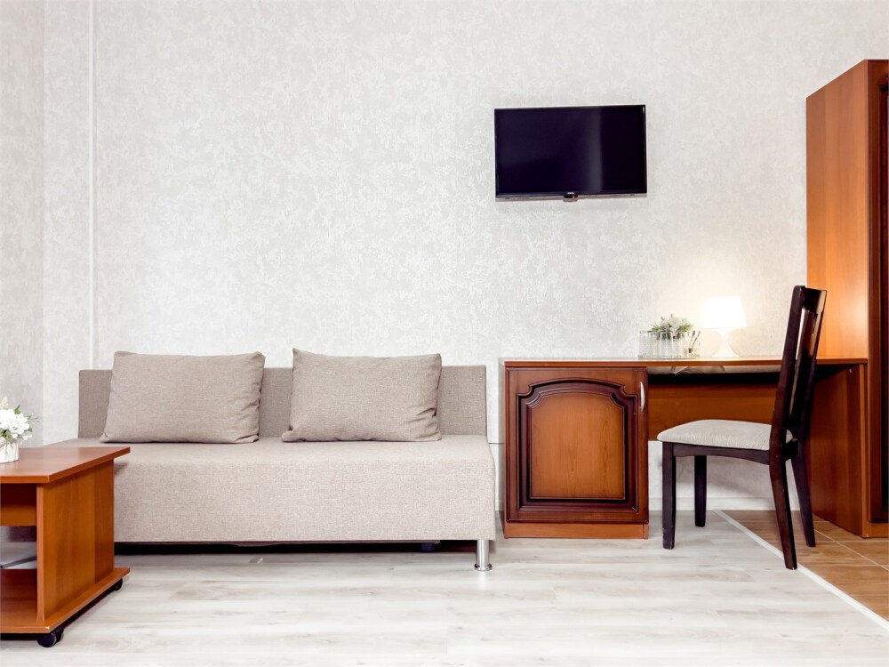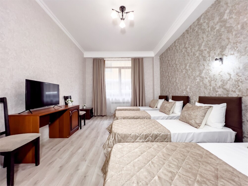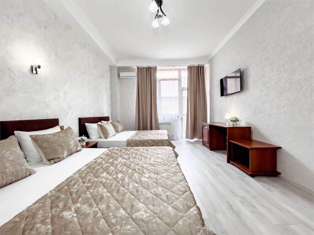 Просторный и функциональный номер с видом на городской пейзаж. Оснащен всем необходимым для комфортного пребывания: удобные кровати и диван, эргономичная рабочая зона с удобным столом и креслом, современная ванная комната. Идеальный выбор для деловых поездок и семейного отдыха с возможностью размещения до 4 человек. Один ребёнок до 5 лет — можно без отдельного спального места.