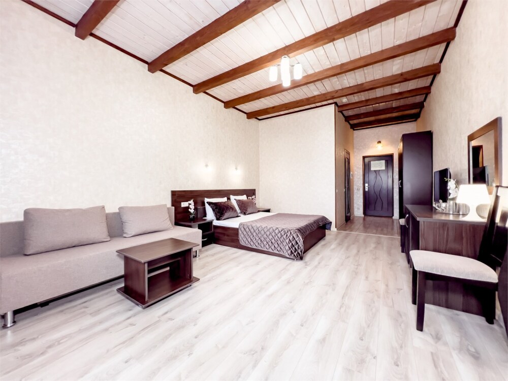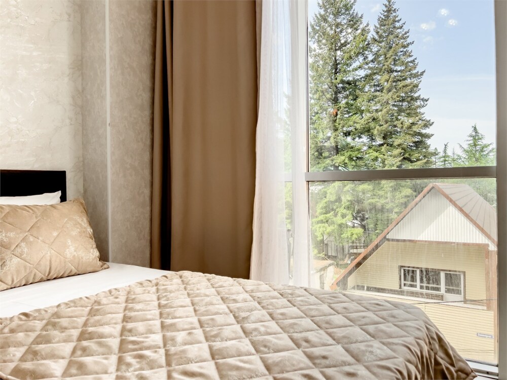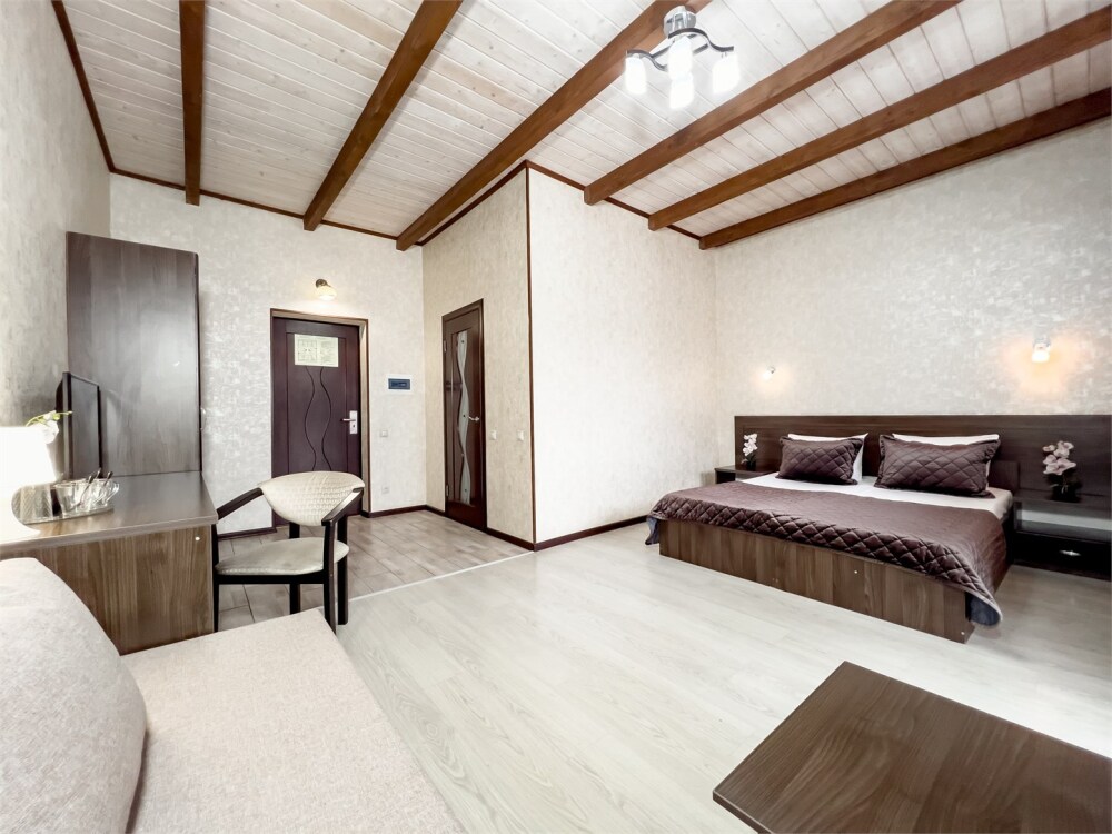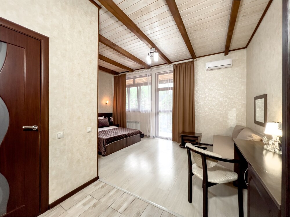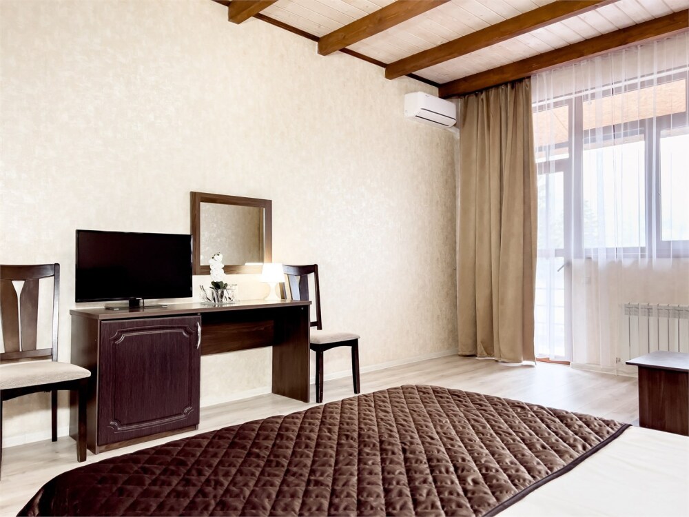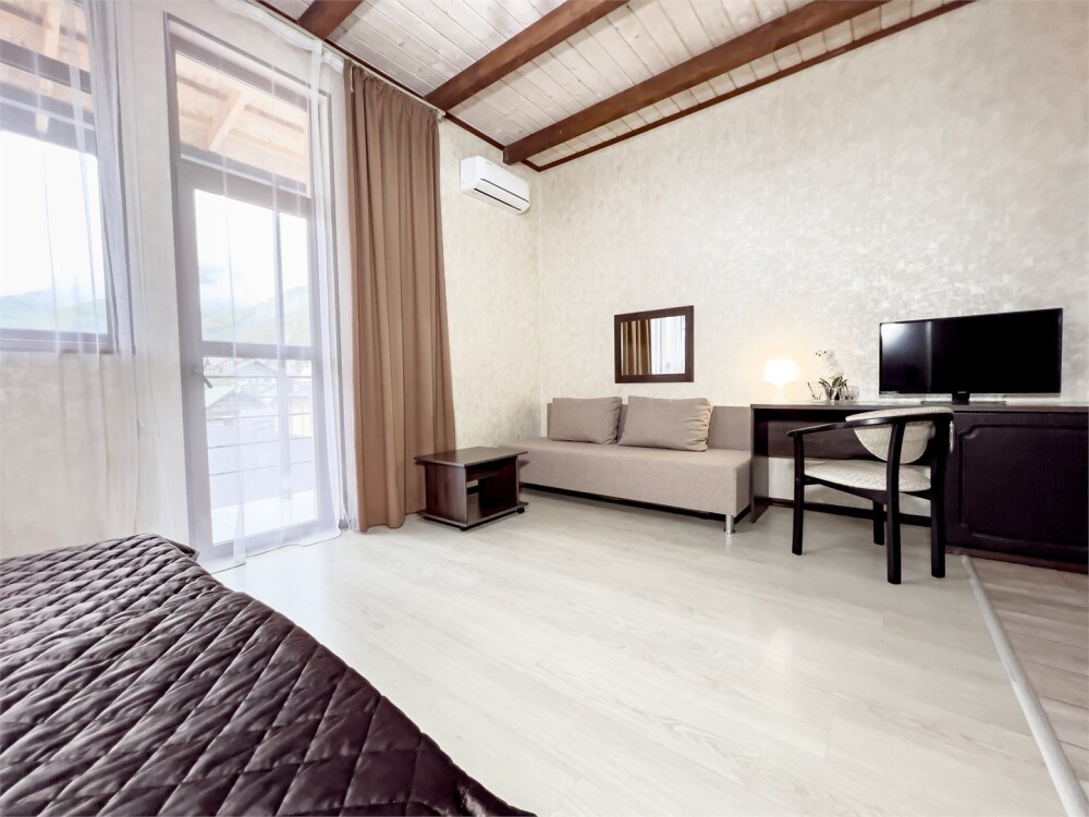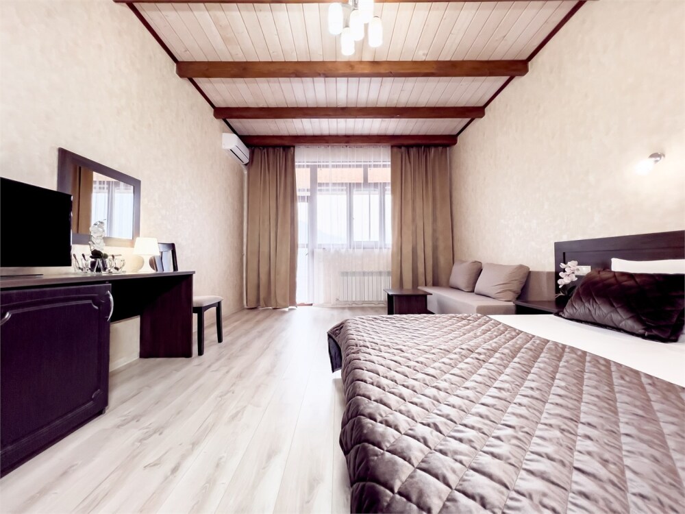 Премиальный номер расположенный на 5 этаже. Изысканный интерьер, балкон с захватывающим видом на горы и расширенный набор удобств, включая просторную эргономичную рабочую зону, создают атмосферу роскоши и комфорта. Идеальный выбор для особых случаев с возможностью размещения до 4 гостей.