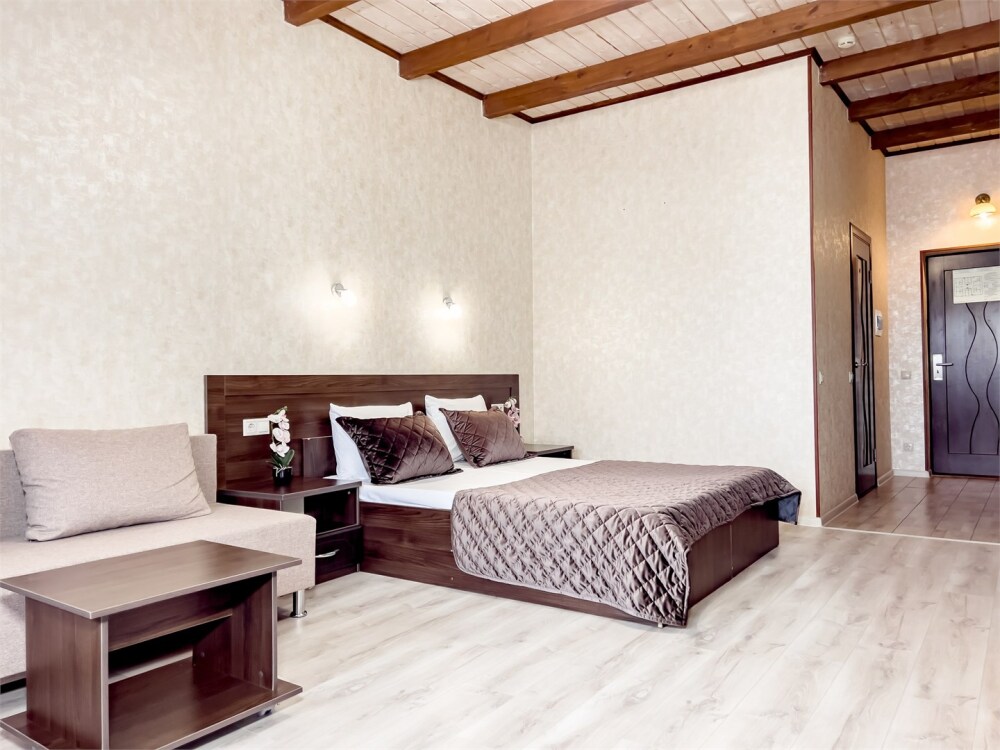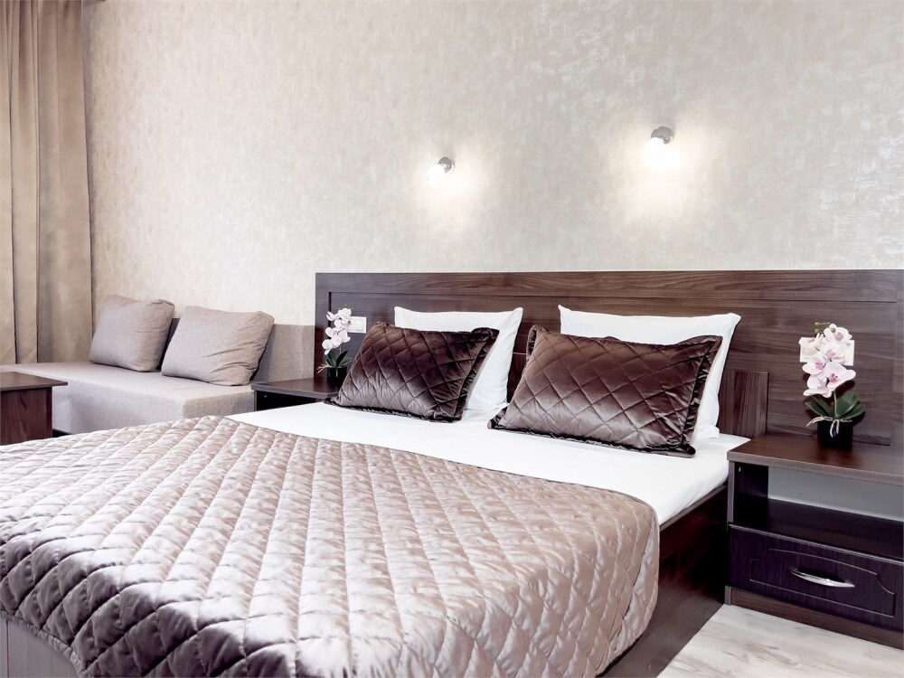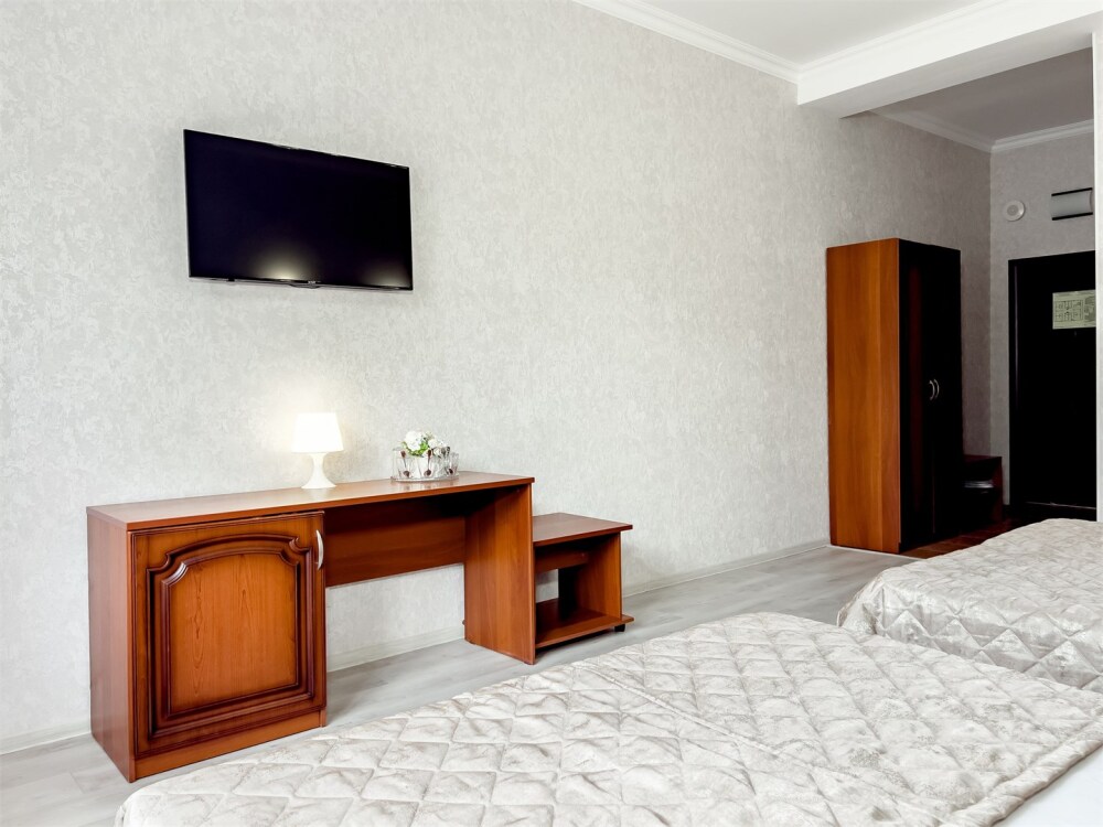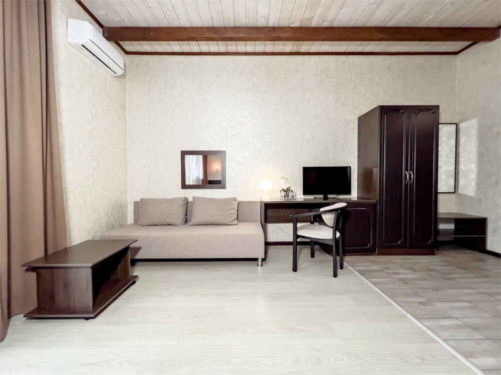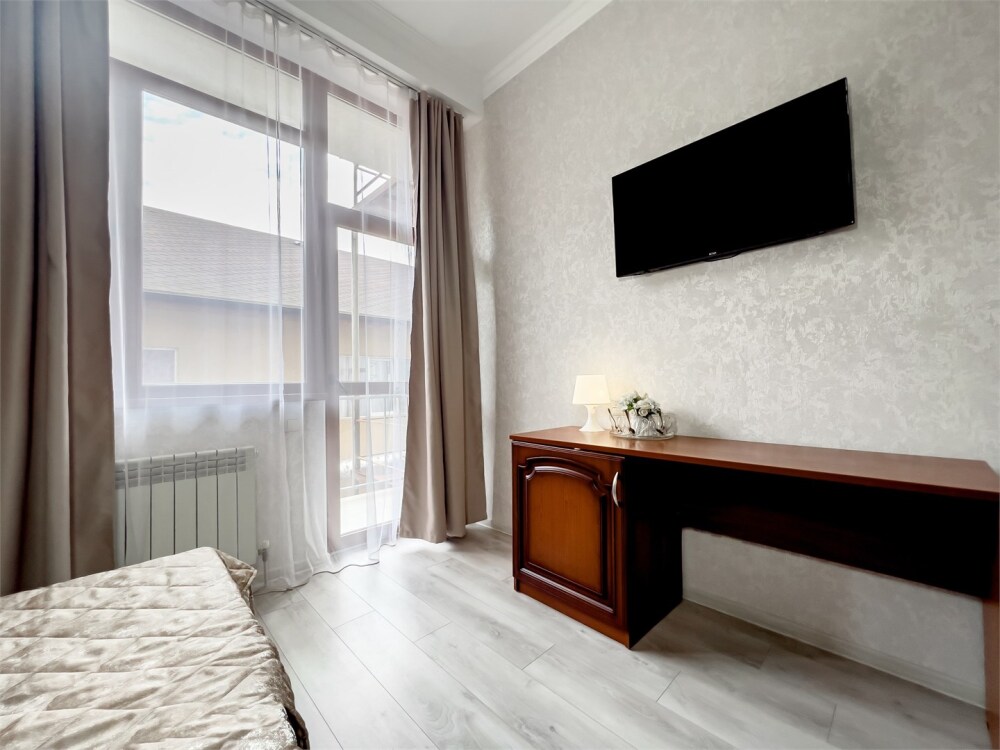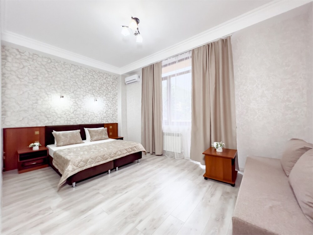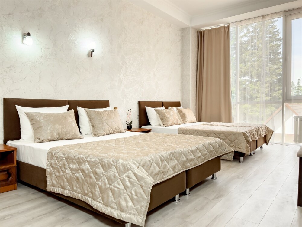 Премиальный номер расположенный на 5 этаже. Изысканный интерьер, балкон с захватывающим видом на горы и расширенный набор удобств, включая просторную эргономичную рабочую зону, создают атмосферу роскоши и комфорта. Идеальный выбор для особых случаев с возможностью размещения до 4 гостей.