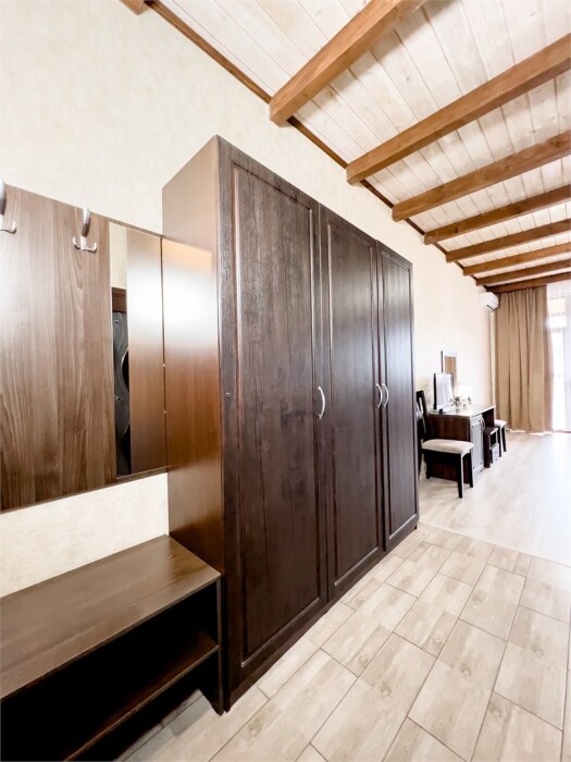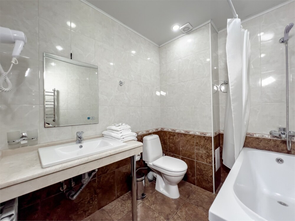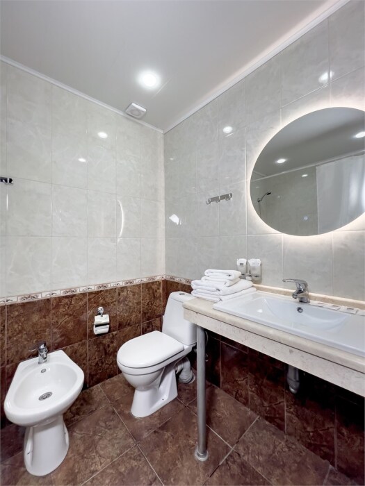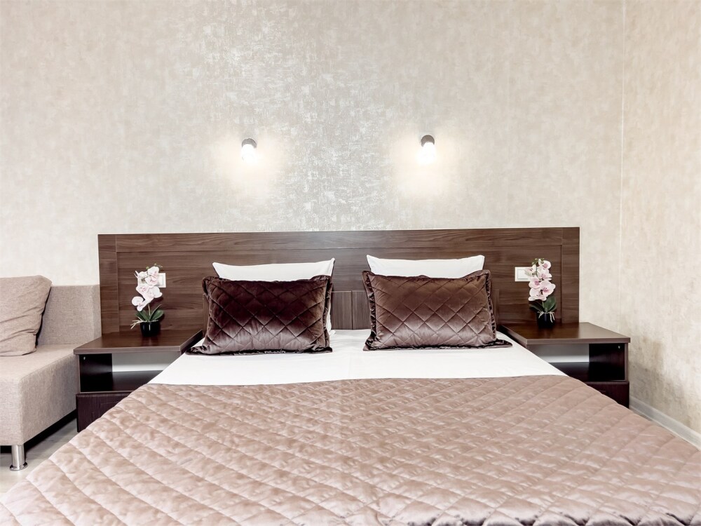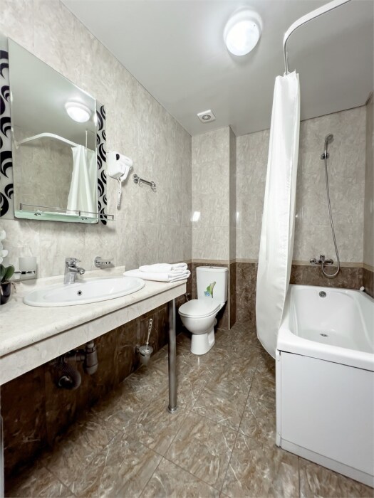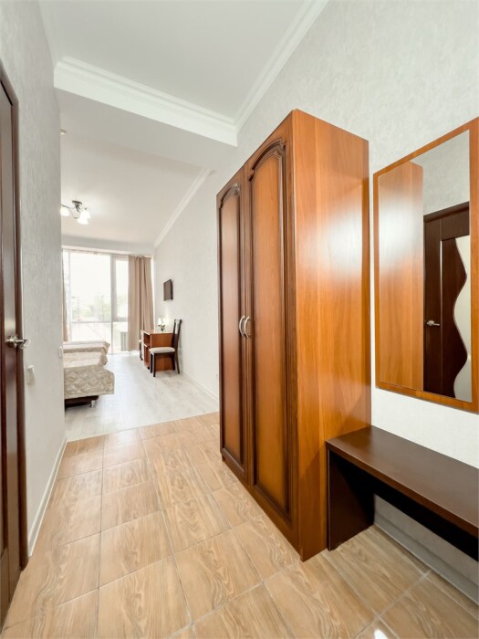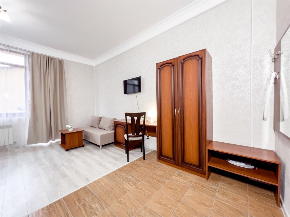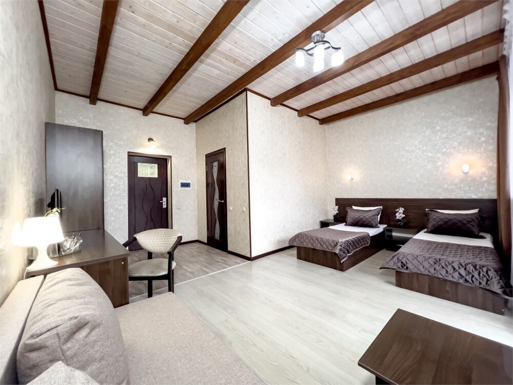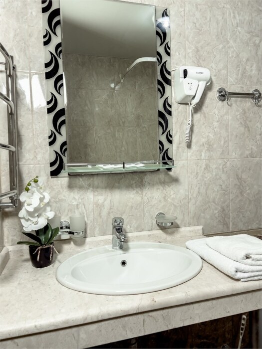 Премиальный номер расположенный на 5 этаже. Изысканный интерьер, балкон с захватывающим видом на горы и расширенный набор удобств, включая просторную эргономичную рабочую зону, создают атмосферу роскоши и комфорта. Идеальный выбор для особых случаев с возможностью размещения до 4 гостей.