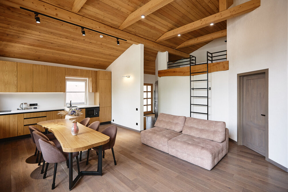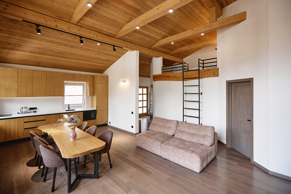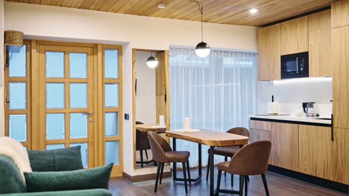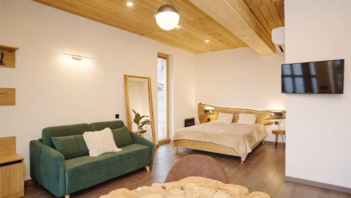 Апартамент на 2 этажа с удобной кроватью и раскладывающимся диваном, а также с современной оборудованной кухней. Душевая кабина и стиральная машина. Номер наполнен качественной мебелью. Здание построено с использованием современных отделочных материалов.