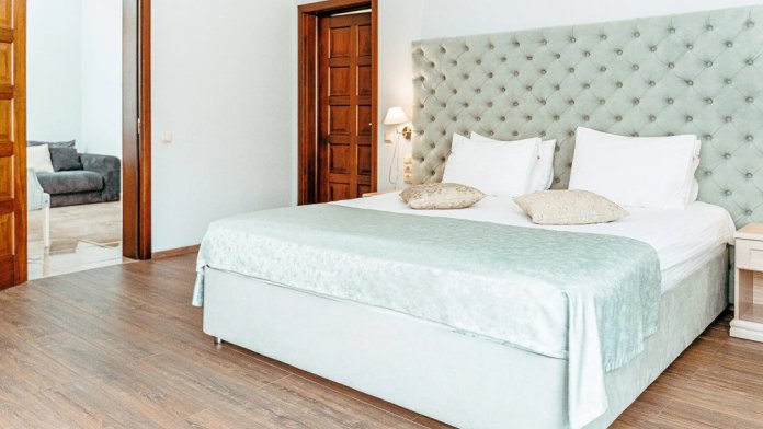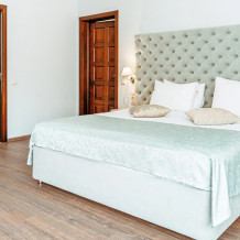 Люкс двухкомнатный — просторный номер с 2-мя изолированными комнатами и открытой террасой. Вмещает до 5-ти человек. Оформлен в светлых тонах и оснащен всем необходимым: мини-бар, телевизор, кондиционер, чайный сет. В номере большая двуспальная кровать и двуспальный диван, имеется межкомнатная дверь.