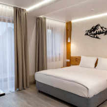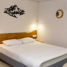 Комфортный однокомнатный номер с двуспальной кроватью, раскладным креслом и окном с видом на горы или во внутренний двор отеля.