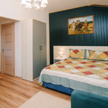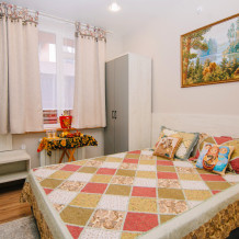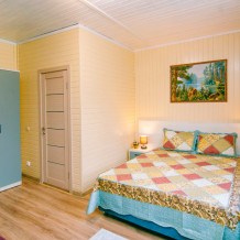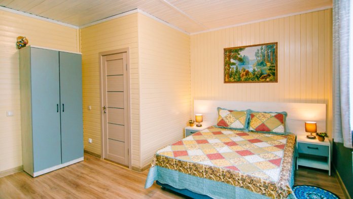 Просторный оформленный в русском стиле однокомнатный номер с большой двуспальной кроватью, двухместным раскладным диваном и окном с видом на горы или во внутренний двор отеля. Большая часть номеров с террасой.