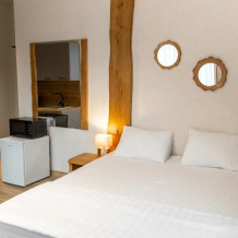 Просторный однокомнатный номер с большой двуспальной кроватью, двухместным раскладным диваном и окном с видом на горы или во внутренний двор отеля. Большая часть номеров с террасой.