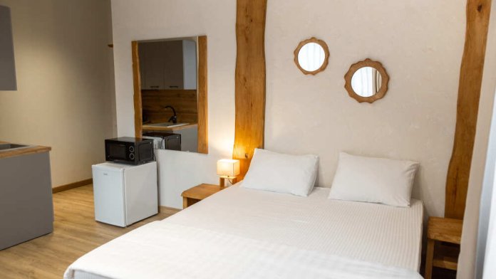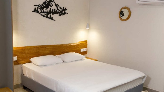 Уютный однокомнатный номер с двуспальной кроватью и окном с видом на горы или во внутренний двор отеля.
