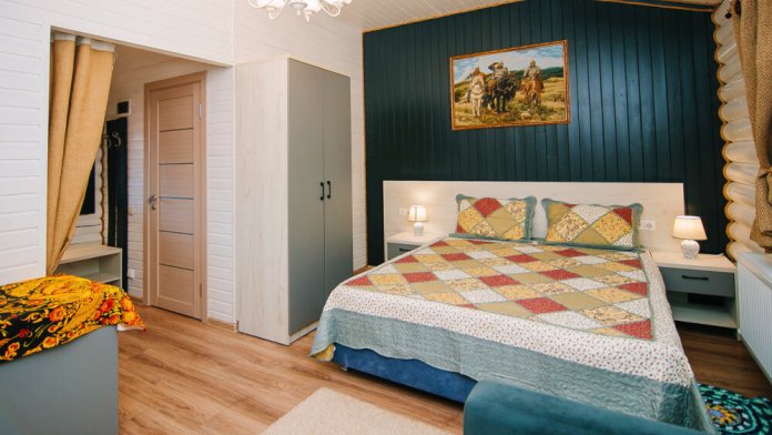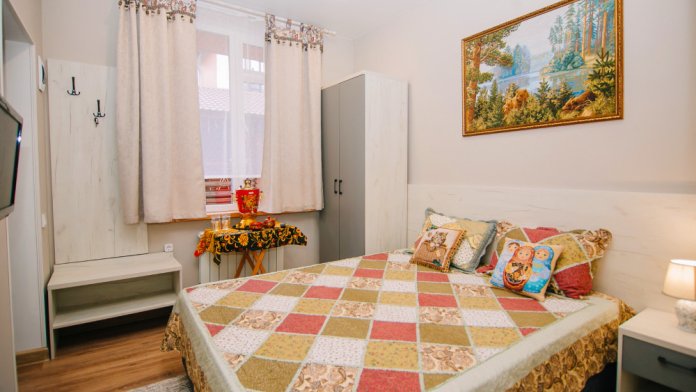 Уютный оформленный в русском стиле однокомнатный номер с двуспальной кроватью и окном с видом на горы или во внутренний двор отеля.