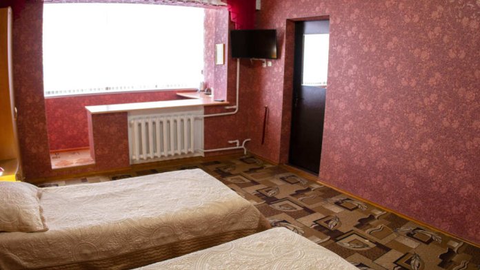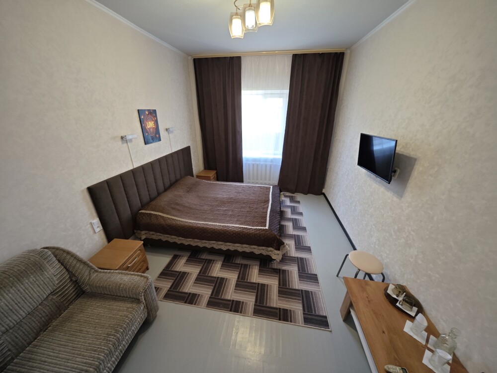 №13. Просторный улучшенный номер находится в отдельном корпусе от основного здания для тех, кому важно уют и тишина от соседей, отвечает всем современным требованиям комфорта. Оснащение номера: оборудован двуспальной кроватью и просторным диваном, телевизор с плоским экраном 32», сплит система, холодильник, микроволновка, чайник, письменный стол и журнальный столик с необходимой посудой и многое другое. В ванной комнате: ванная, туалет, фен, бесплатные гигиенические принадлежности: мыло, шампунь, комплект полотенец. Утюг с гладильной доской на 1 этаже основного корпуса.