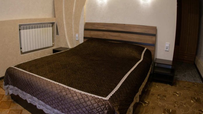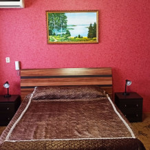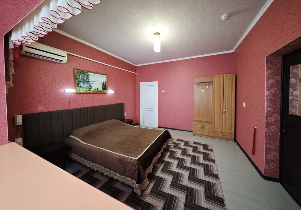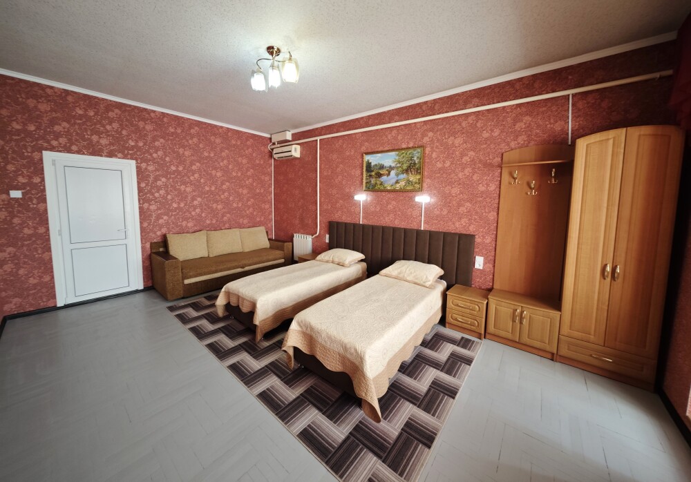 №12. Просторный улучшенный номер находится в отдельном корпусе от основного здания для тех, кому важно уют и тишина от соседей, отвечает всем современным требованиям комфорта. Оснащение номера: оборудован двуспальной кроватью и просторным диваном, телевизор с плоским экраном 32», сплит система, холодильник, микроволновка, чайник, письменный стол и журнальный столик с необходимой посудой и многое другое. В ванной комнате: ванная, туалет, фен, бесплатные гигиенические принадлежности: мыло, шампунь, комплект полотенец. Утюг с гладильной доской на 1 этаже основного корпуса.