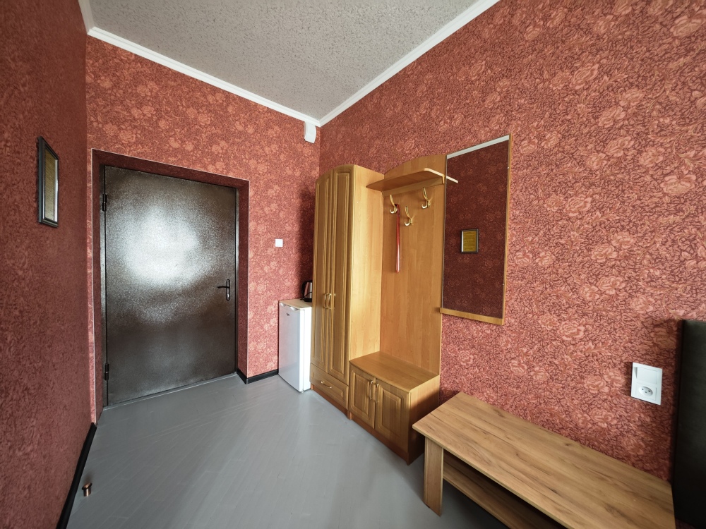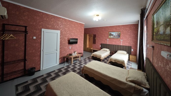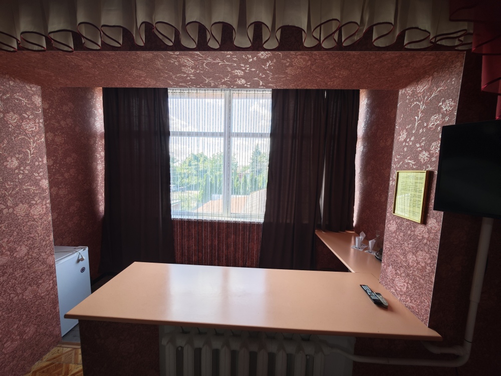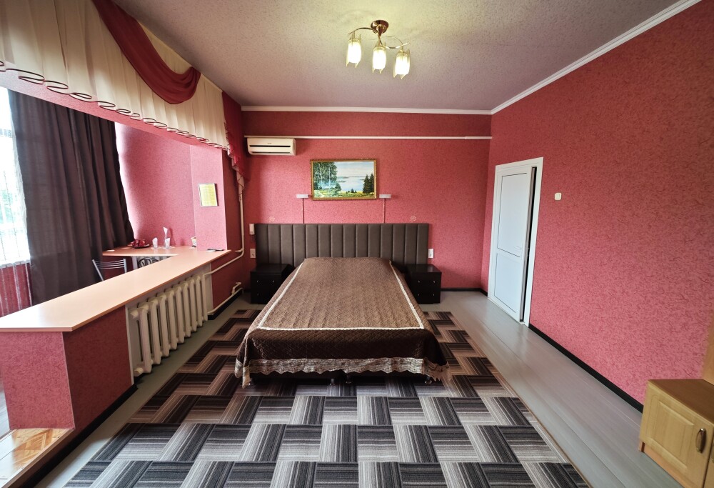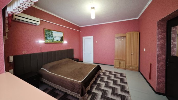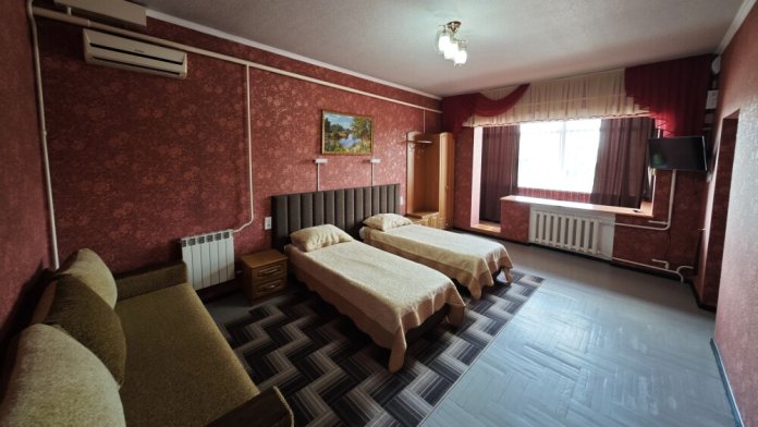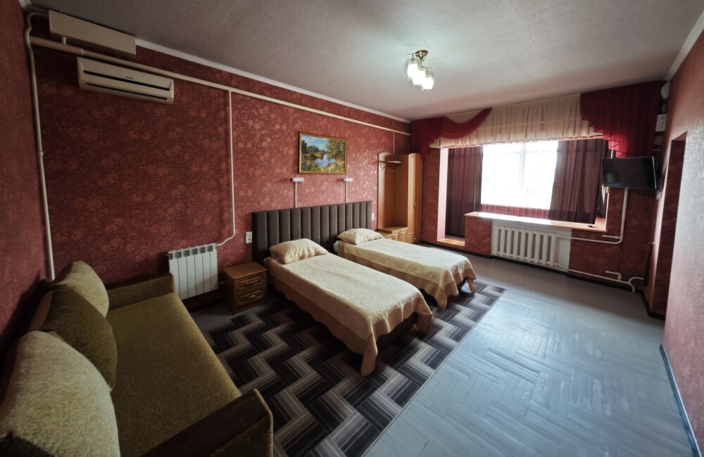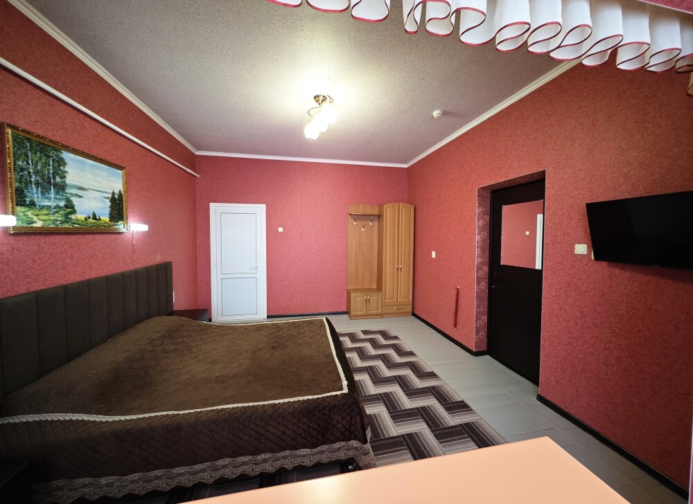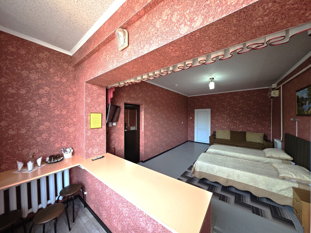 №11. Просторный улучшенный номер находится в отдельном корпусе от основного здания для тех, кому важно уют и тишина от соседей, отвечает всем современным требованиям комфорта. Оснащение номера: оборудован двуспальной кроватью и просторным диваном, телевизор с плоским экраном 32», сплит система, холодильник, микроволновка, чайник, письменный стол и журнальный столик с необходимой посудой и многое другое. В ванной комнате: душ, туалет, фен, бесплатные гигиенические принадлежности: мыло, шампунь, комплект полотенец. Утюг с гладильной доской на 1 этаже основного корпуса.