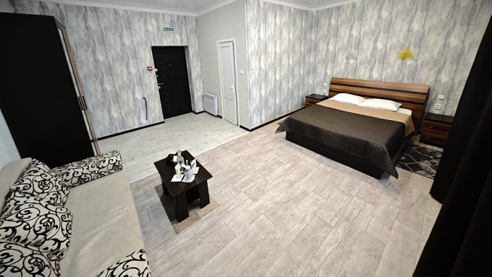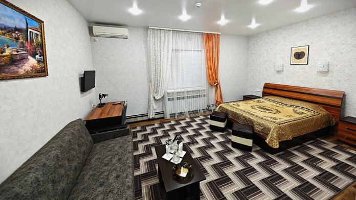 №14. Просторный улучшенный номер находится в отдельном корпусе от основного здания для тех, кому важно уют и тишина от соседей, отвечает всем современным требованиям комфорта. Оснащение номера: оборудован двуспальной кроватью и просторным диваном, телевизор с плоским экраном 32», сплит система, холодильник, микроволновка, чайник, письменный стол и журнальный столик с необходимой посудой и многое другое. В ванной комнате: ванная, туалет, фен, бесплатные гигиенические принадлежности: мыло, шампунь, комплект полотенец. Утюг с гладильной доской на 1 этаже основного корпуса.