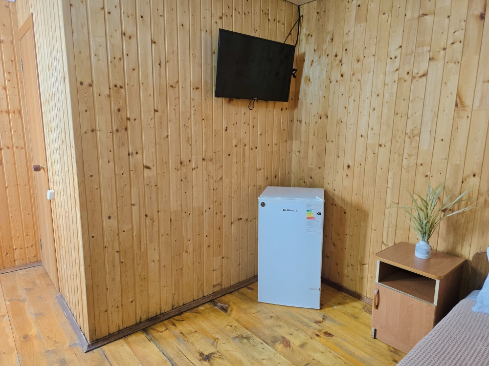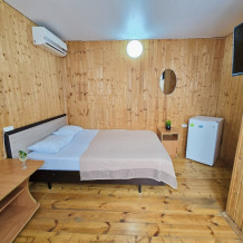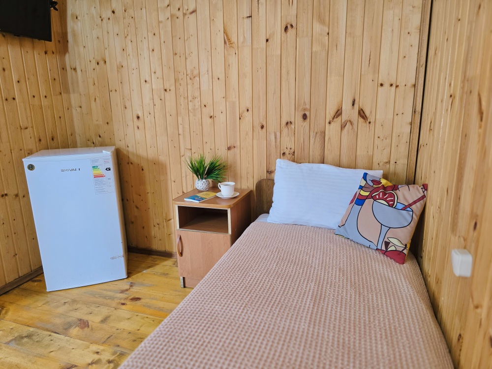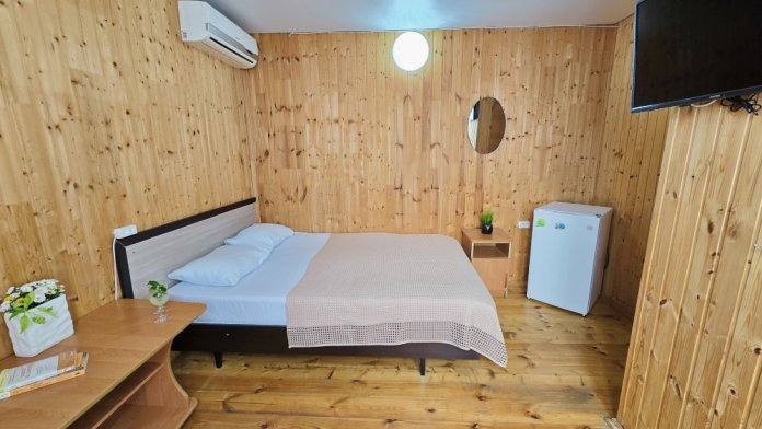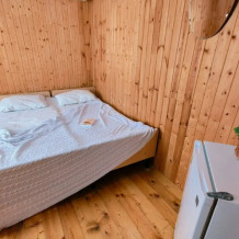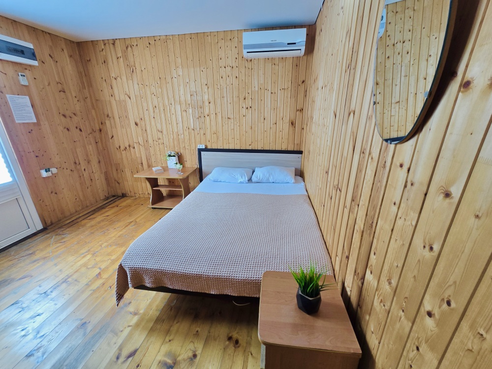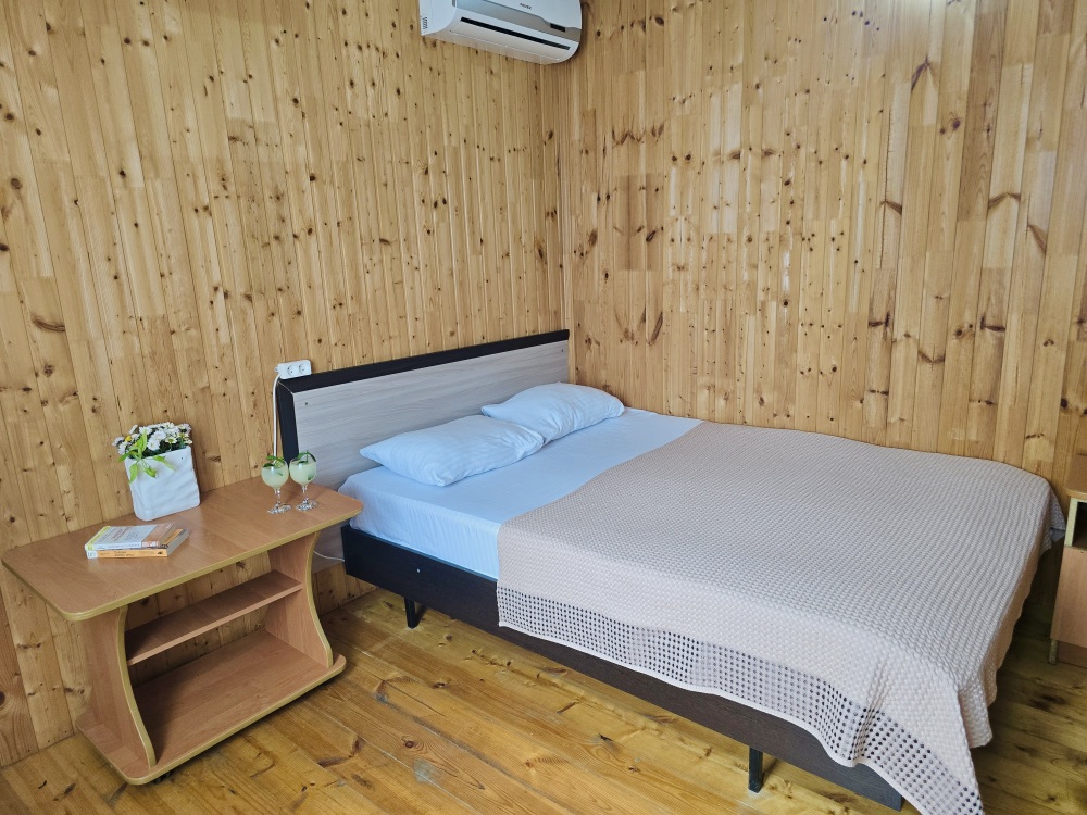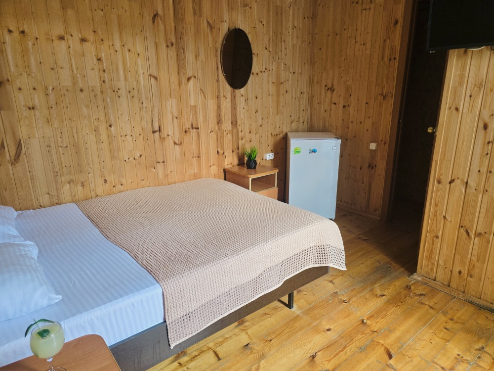 На территории расположены 18 деревянных домиков. В каждом домике спальная мебель, телевизор, сплит-система, холодильник, санузел с душем и гигиенические принадлежности.