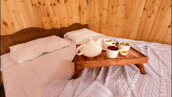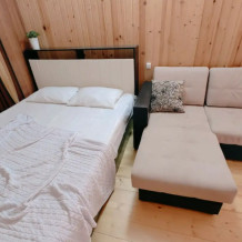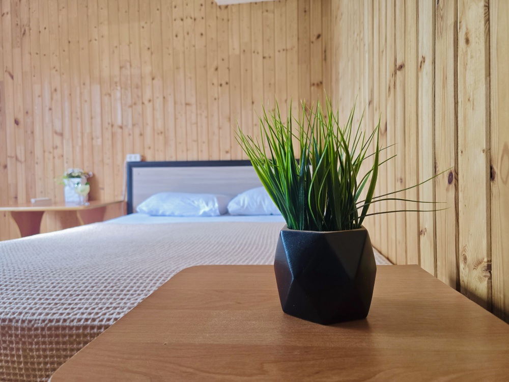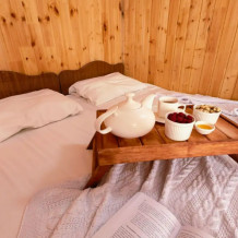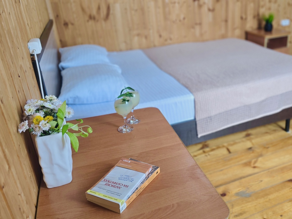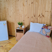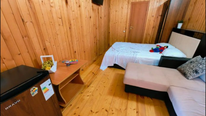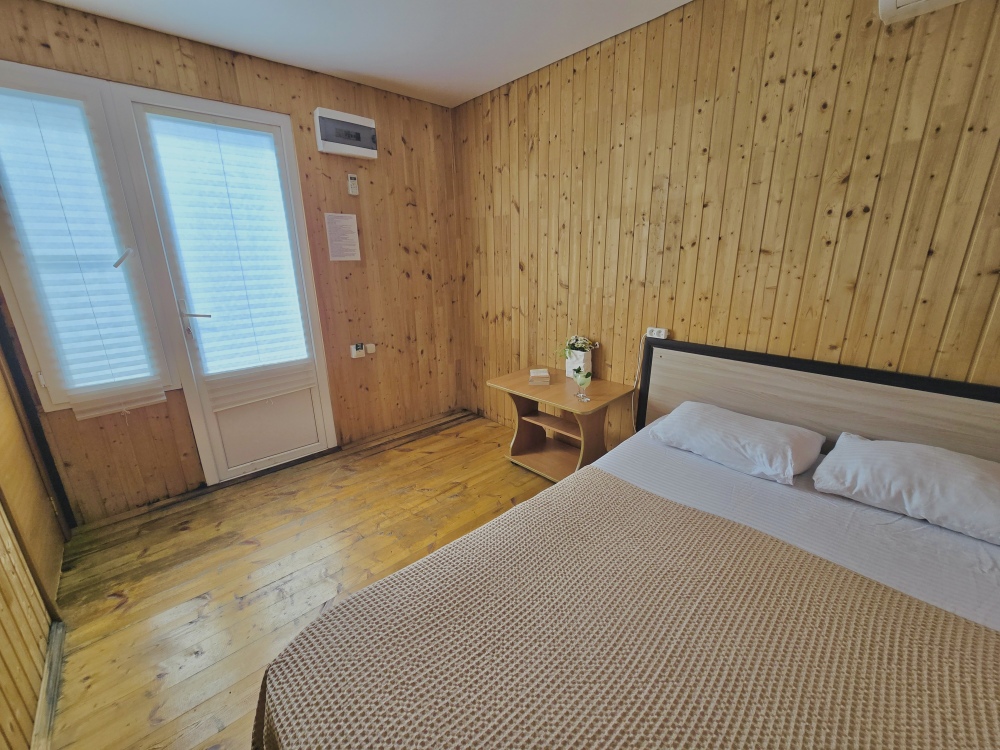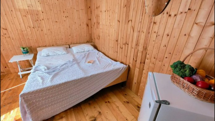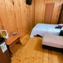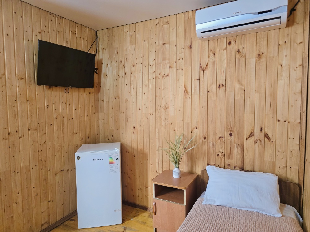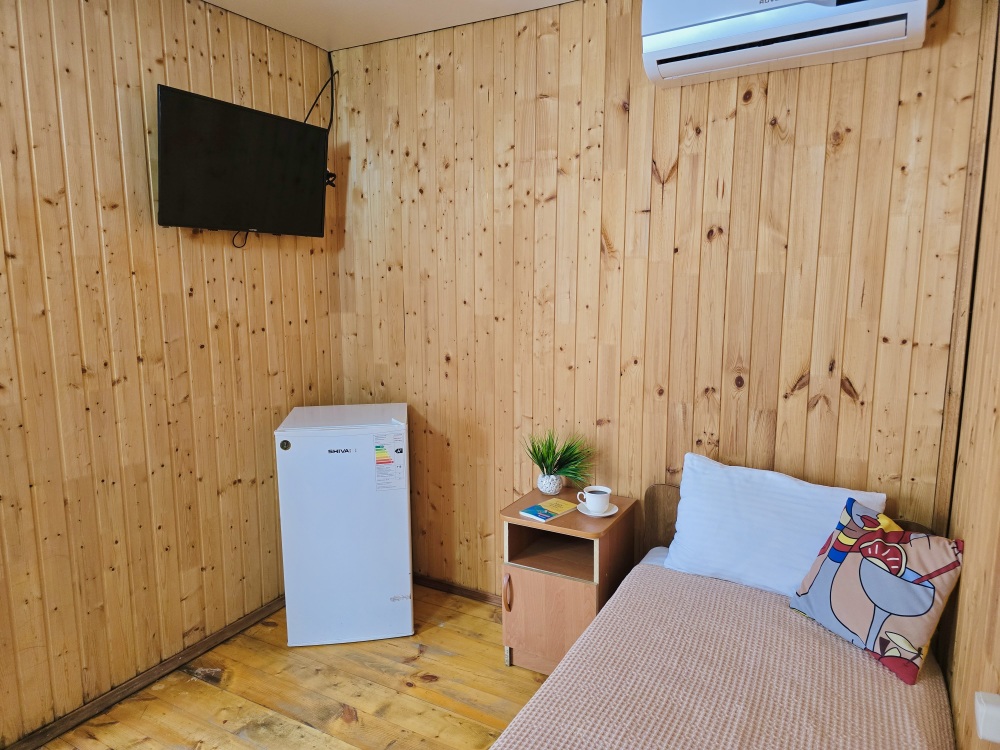 На территории расположены 18 деревянных домиков. В каждом домике спальная мебель, телевизор, сплит-система, холодильник, санузел с душем и гигиенические принадлежности.