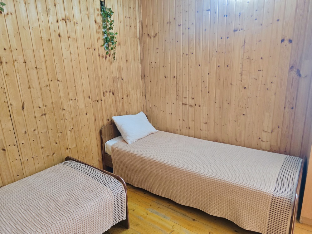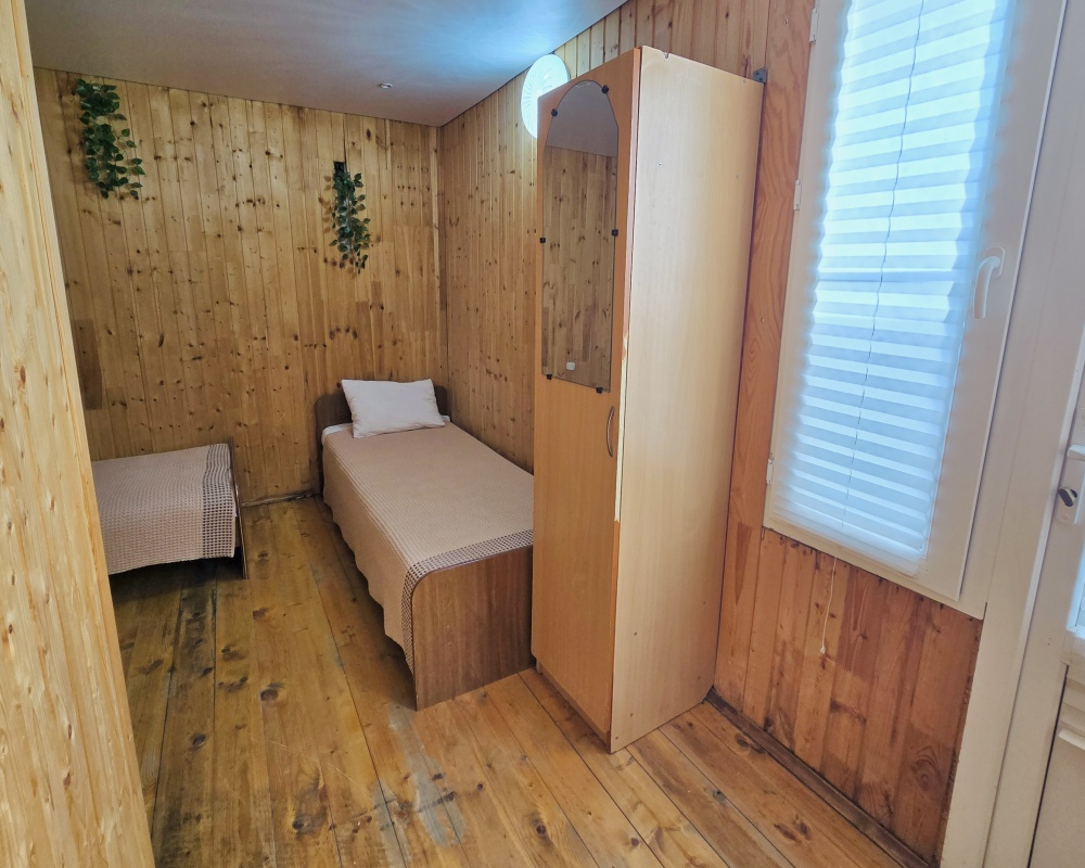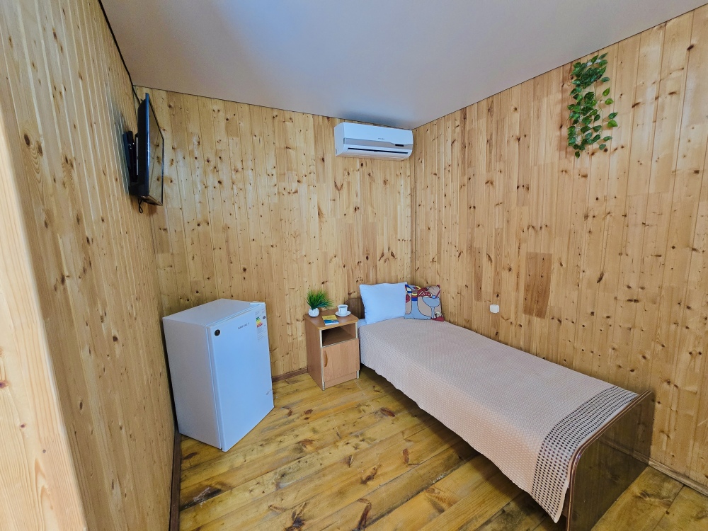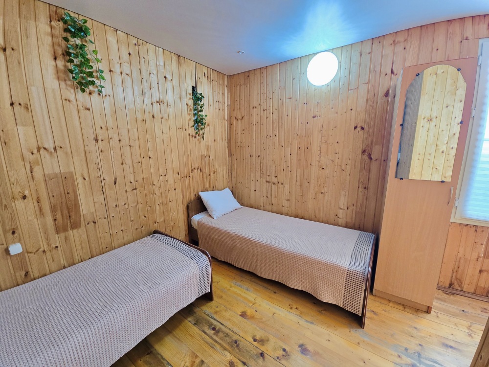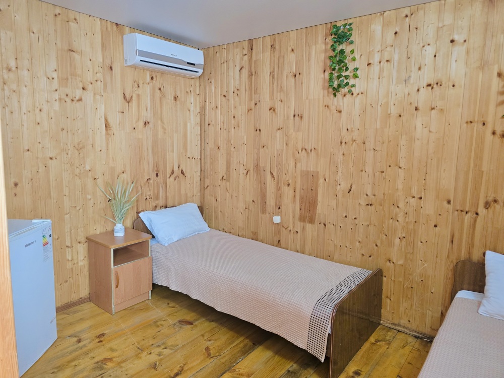 2-х комнатный Дом со своей кухней подходит для проживания 5-6 человек. В нём две отдельные комнаты, санузел с душем.