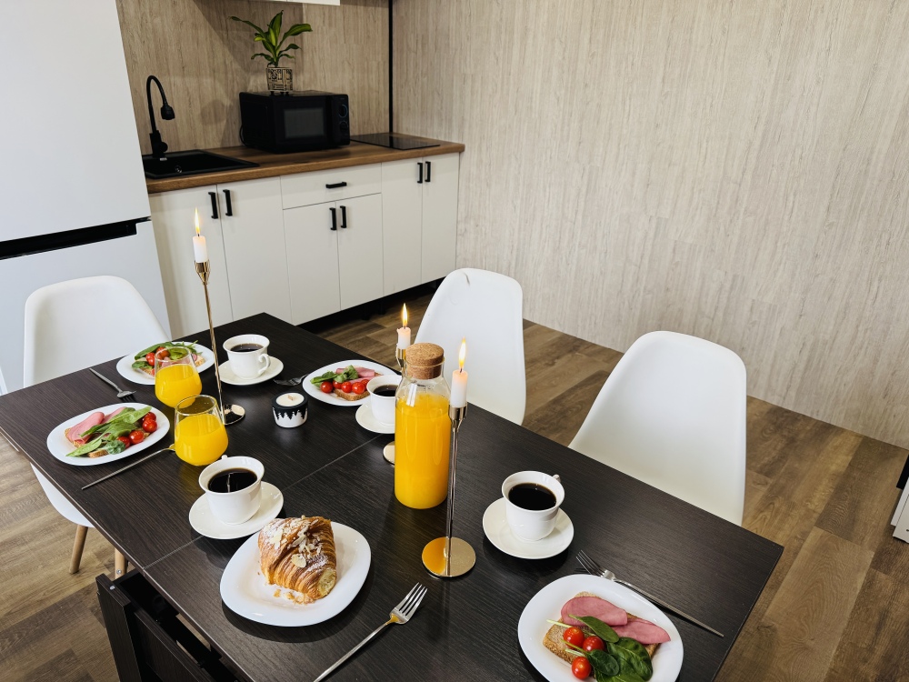 Кухня-столовая: двуспальный диван, шкаф, кухонный гарнитур, варочная панель, электрический чайник, микроволновая печь, набор необходимой посуды, холодильник, сплит -система, телевизор, wi-fi.