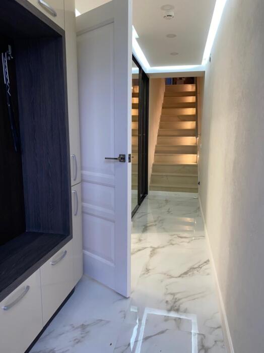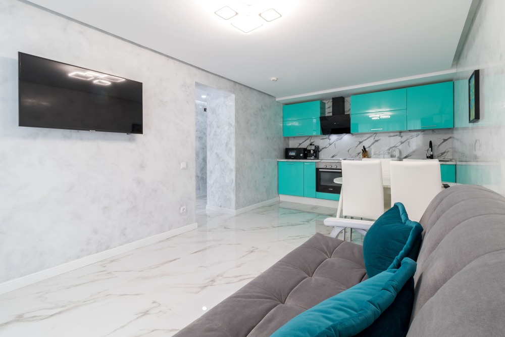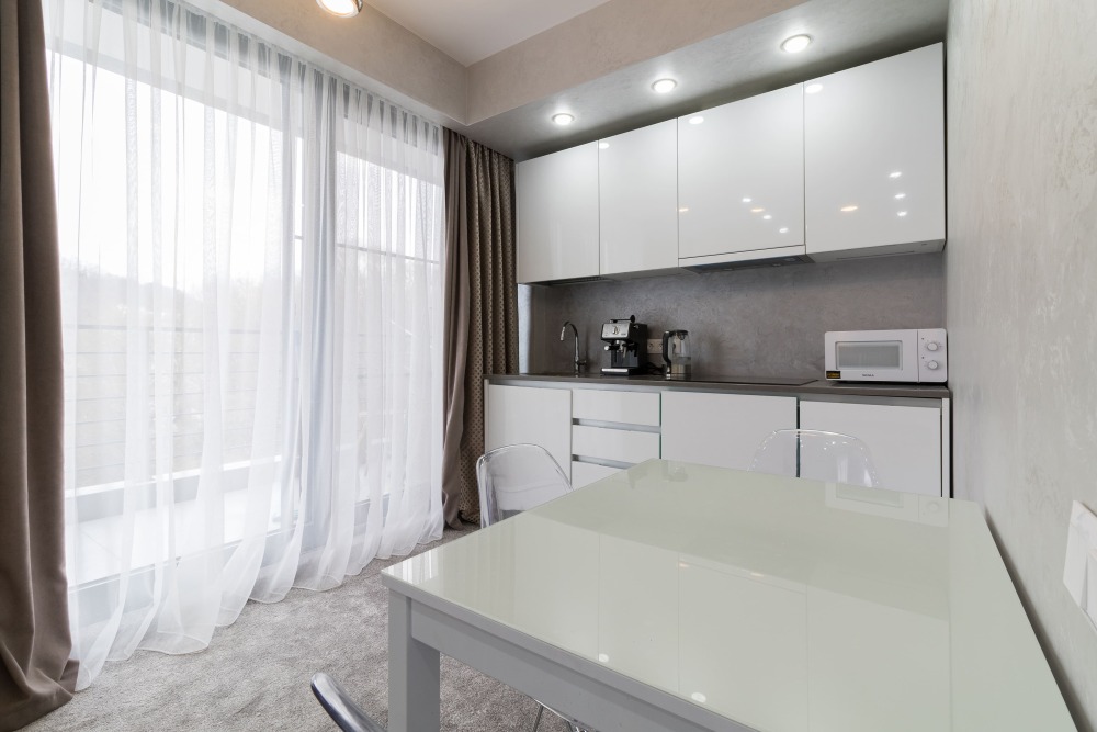 Двухуровневые апартаменты оборудованы кухней на каждом этаже. Мини-кухня на 1 этаже оснащена кухонным гарнитуром, электрическим чайником, посудой, микроволновой печью.