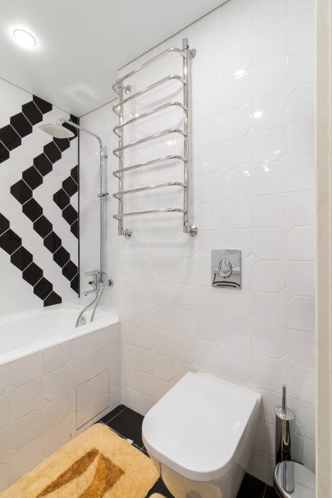В апартаментах две ванные комнаты. В ванной комнате на первом этаже душевая кабина, зеркало. На втором этаже полноценная ванна, зеркало, фен, стиральная машина.