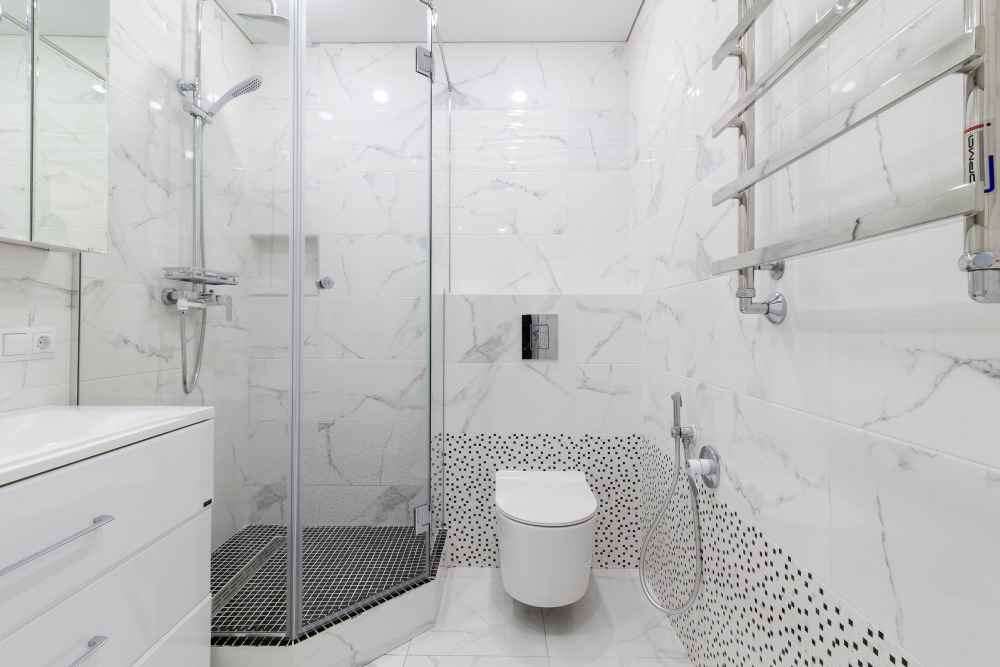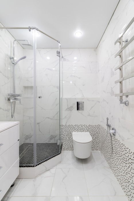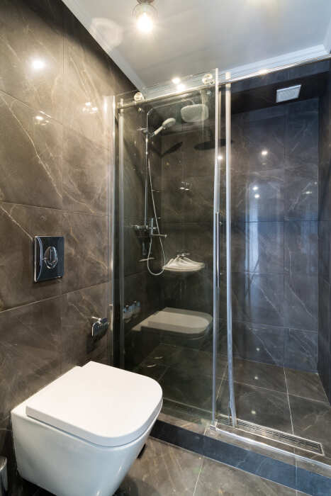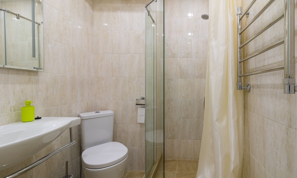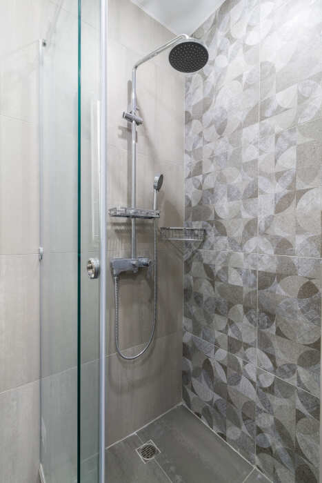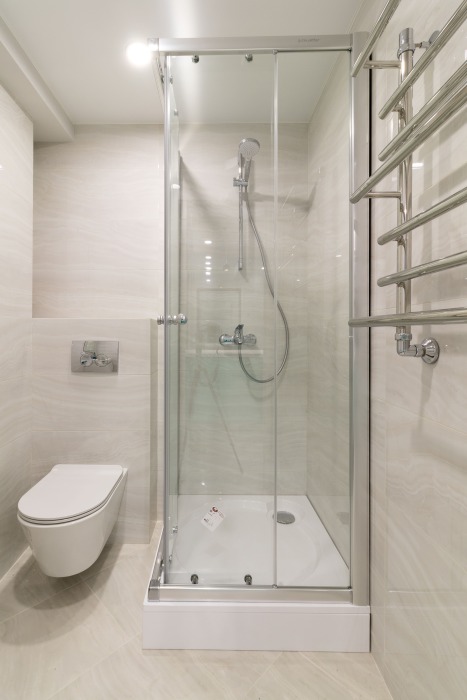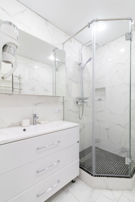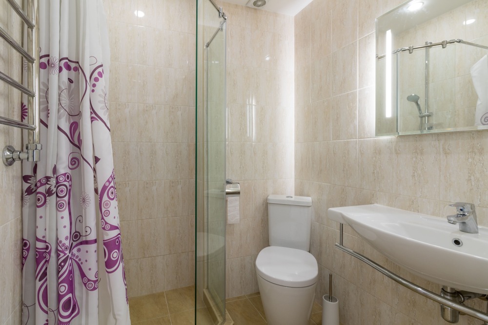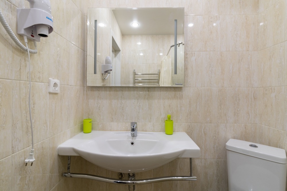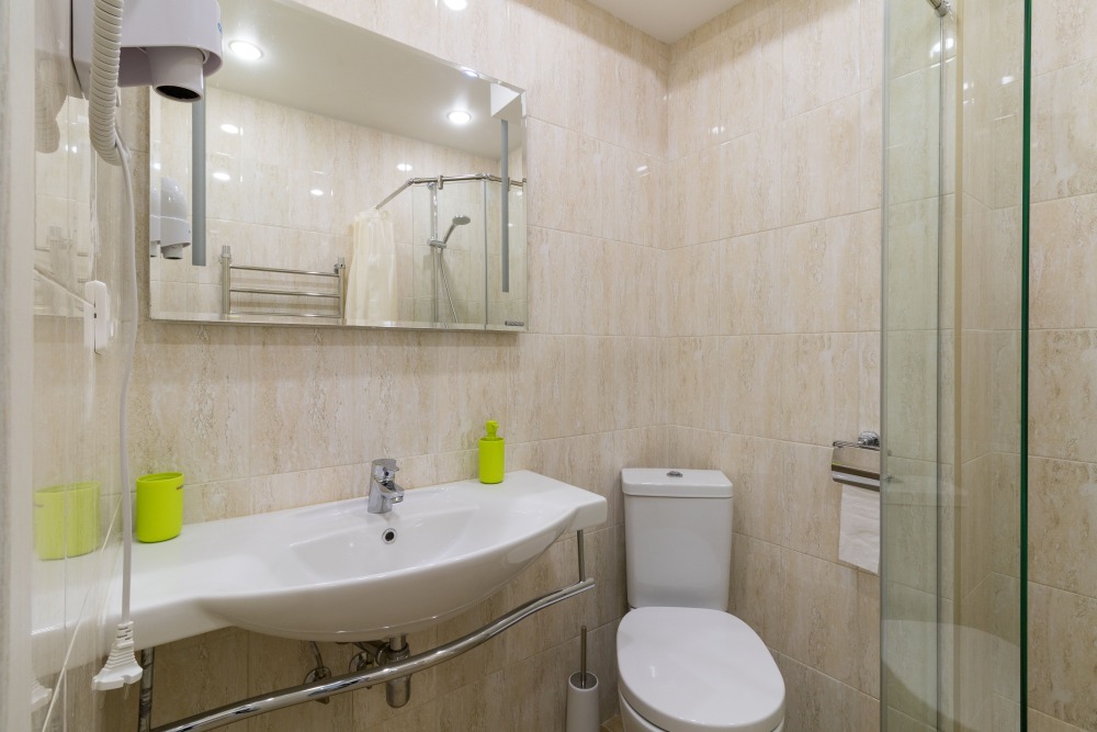 Собственная ванная комната оснащена душевой кабиной, большим зеркалом и феном.