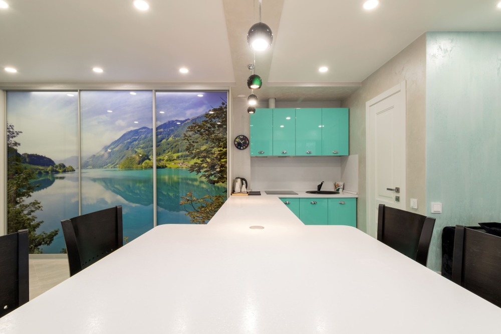Кухня оснащенная варочной поверхностью, духовым шкафом, холодильником, кухонными принадлежностями, рожковой кофемашиной, электрическим чайником, посудомоечной машиной, микроволновой печью, обеденной зоной.