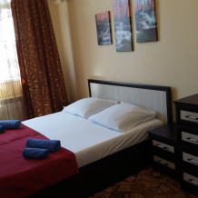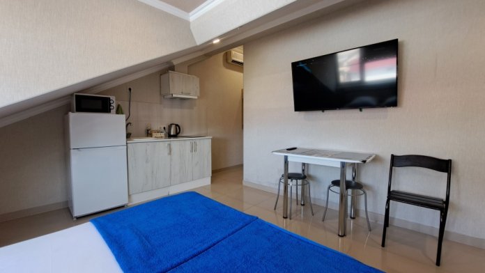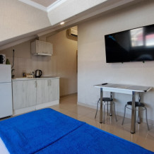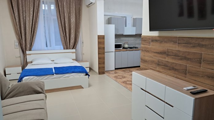 Большой, просторный, светлый, номер студия с кухней. Есть все кухонные принадлежности, мебель, постельное белье, стиральная машинка, кондиционер.