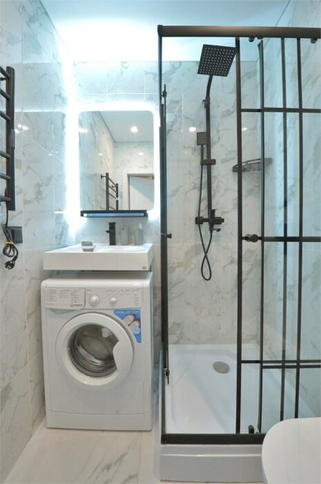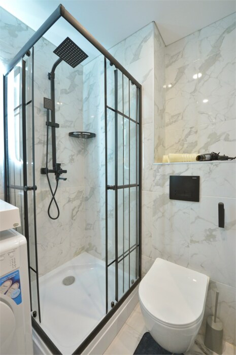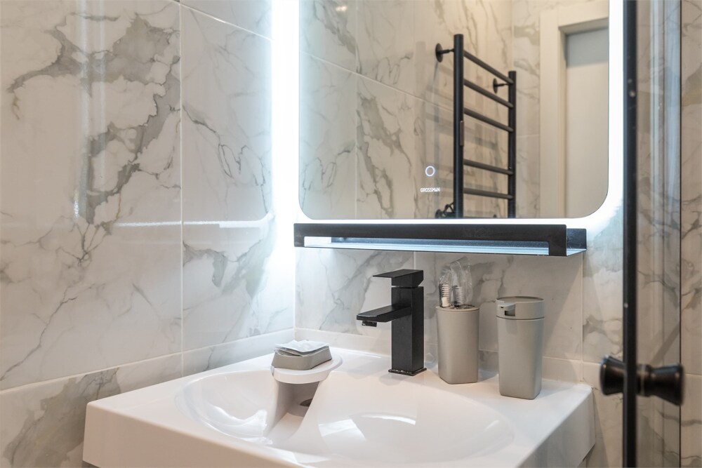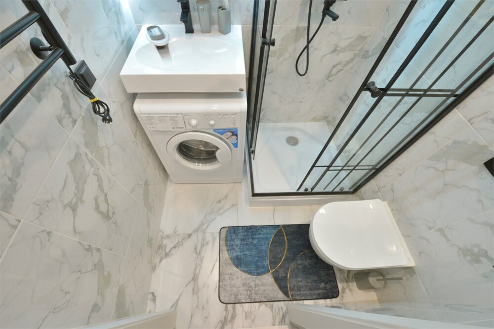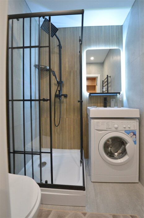 В просторных апартаментах с ремонтом в светлых тонах есть все для комфортного проживания: большая кровать, прикроватная тумба, телевизор, прихожая и собственная ванная комната с душевой кабиной.