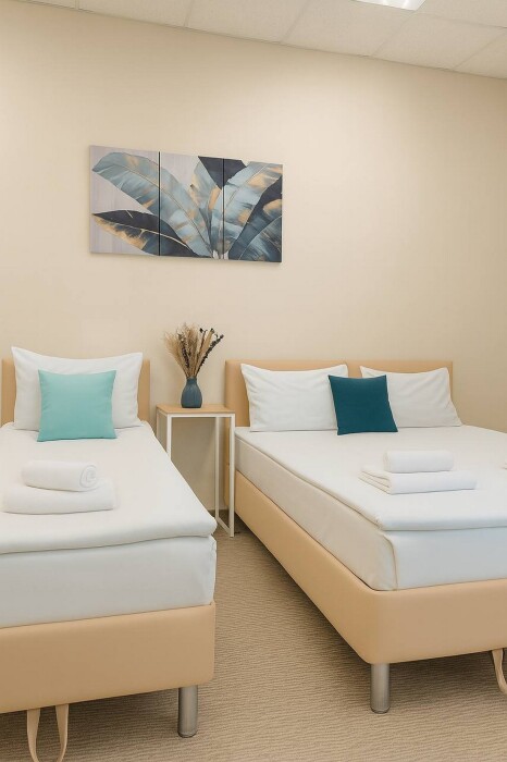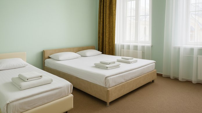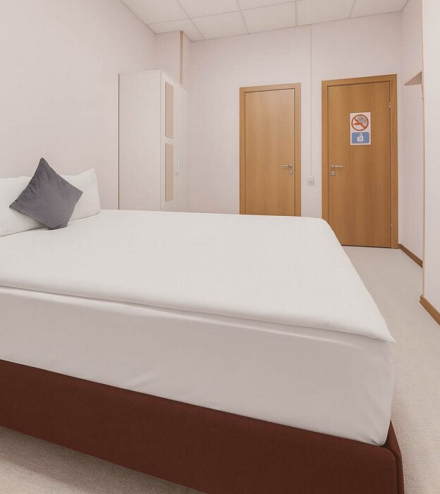 Отдельный номер площадью от 11,7 м2 до 15,8 м2. В номере: двуспальная кровать 160*200 и односпальная кровать 80*200, стол, стулья, шкаф с вешалками для одежды, телевизор, холодильник, чайник, чайный набор. Санузел с душем, фен, туалетные принадлежности (шампунь и гель для душа, туалетная бумага, освежитель воздуха)