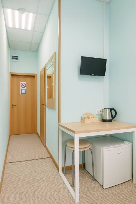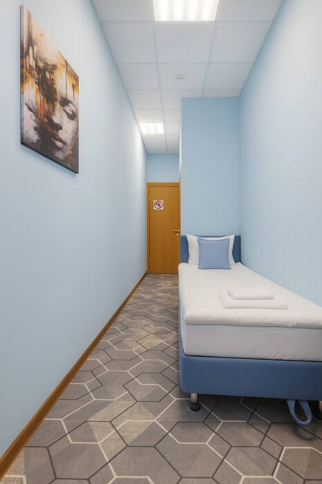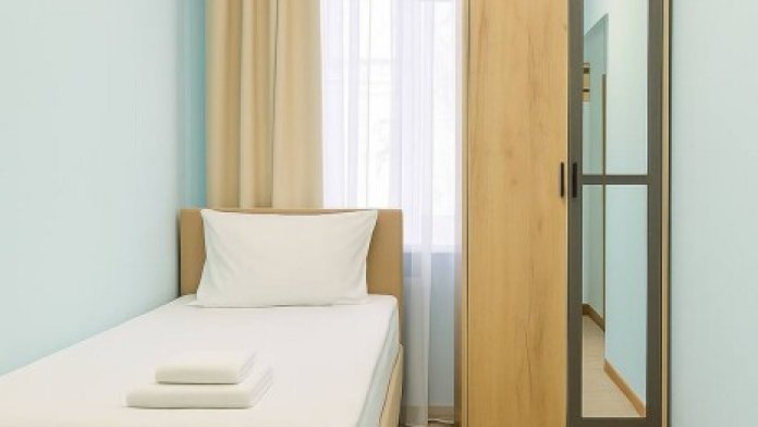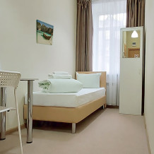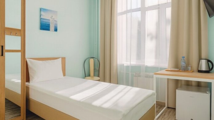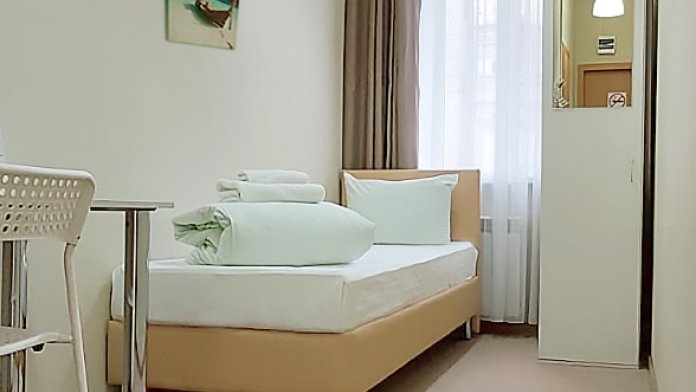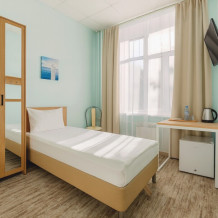 Отдельный номер с ремонтом площадью 7,4 м2 до 10,5 м2. В номере: вешалка для верхней одежды, шкаф с вешалками для одежды, односпальная кровать 90*200 с ортопедическим матрасом, стол, мягкий стул, телевизор от 32 дюймов, холодильник, чайник, чайный набор, питьевая вода 0,5 л., салфетки. Санузел с душем, фен, туалетные принадлежности (шампунь и гель для душа, зубной набор, туалетная бумага, освежитель воздуха). Махровый халат и тапочки