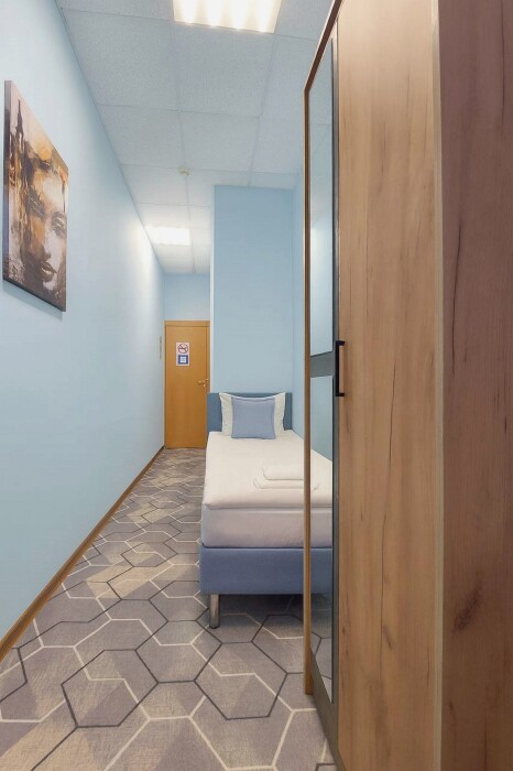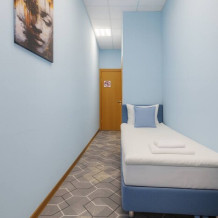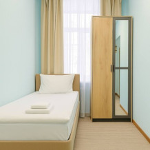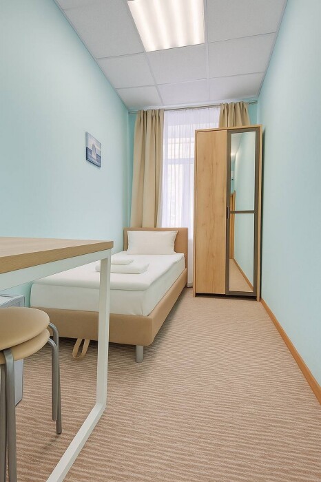 Отдельный номер площадью от 5,5 м2 до 9,7 м2. В номере: односпальная кровать 80*200, стол, стул, вешалки для одежды, телевизор, чайник, чайный набор. Санузел с душем, фен, туалетные принадлежности (шампунь и гель для душа, туалетная бумага, освежитель воздуха)