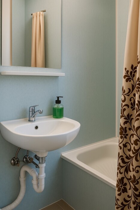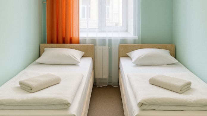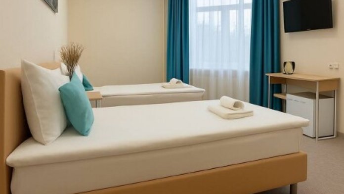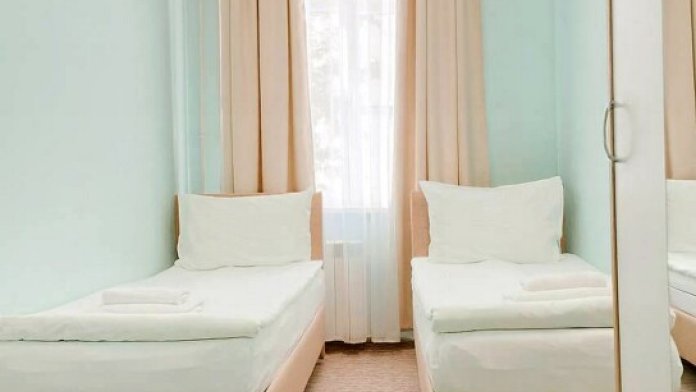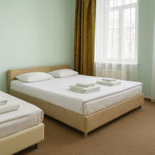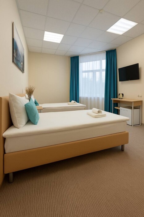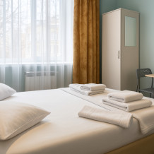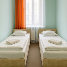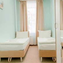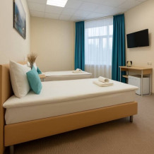 Отдельный номер с ремонтом площадью от 9,4 м2 до 14,0 м2. В номере: вешалка для верхней одежды, две односпальные кровати на 80*200 с ортопедическим, стол, стулья, шкаф с вешалками для одежды, телевизор от 32 дюймов, холодильник, чайник, чайный набор. Санузел с душем, фен, туалетные принадлежности (шампунь и гель для душа, туалетная бумага, освежитель воздуха)