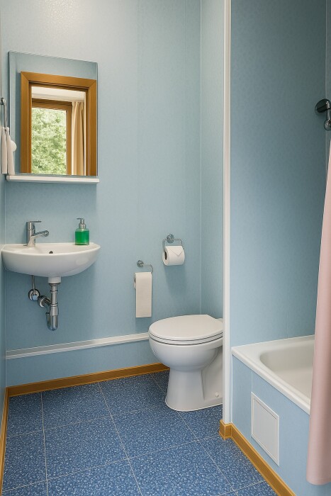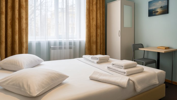 Отдельный номер площадью от 8,2 м2 до 12,5 м2. В номере: двуспальная кровать 140*200 или 160*200, стол, стулья, шкаф с вешалками для одежды, телевизор, холодильник (не во всех номерах), чайник, чайный набор. Санузел с душем, фен, туалетные принадлежности (шампунь и гель для душа, туалетная бумага, освежитель воздуха)
