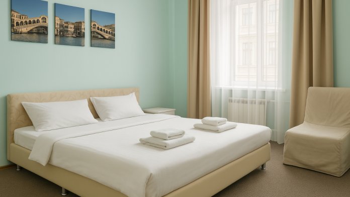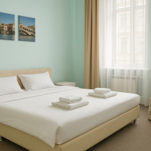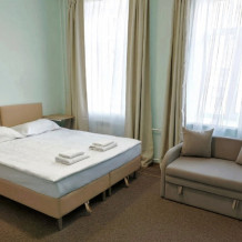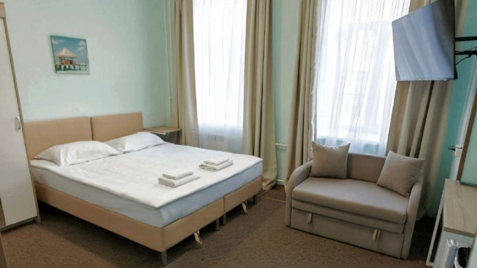 Отдельный номер с ремонтом площадью 15,3 м2. В номере: вешалка для верхней одежды, шкаф для одежды, двуспальная кровать 160*200 с ортопедическим матрасом, раскладной мини-диван, стол, стулья, телевизор от 43 дюймов, холодильник, чайник, чайный набор, питьевая вода 0,5 л., салфетки. Санузел с душем, фен, туалетные принадлежности (шампунь и гель для душа, зубной набор, туалетная бумага, освежитель воздуха). Махровые халаты и тапочки для двух гостей