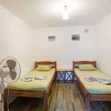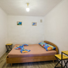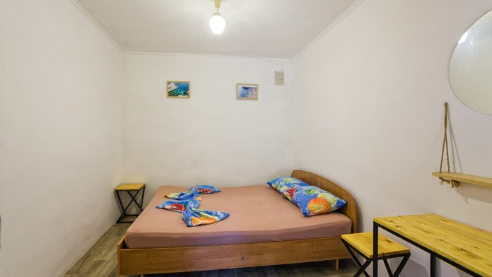 В номере деревянная двухспальная кровать, стеллаж для одежды, зеркало, стол, стулья, вентилятор. Номер прохладный. Туалет и душ общие в отдельном строении во дворе.